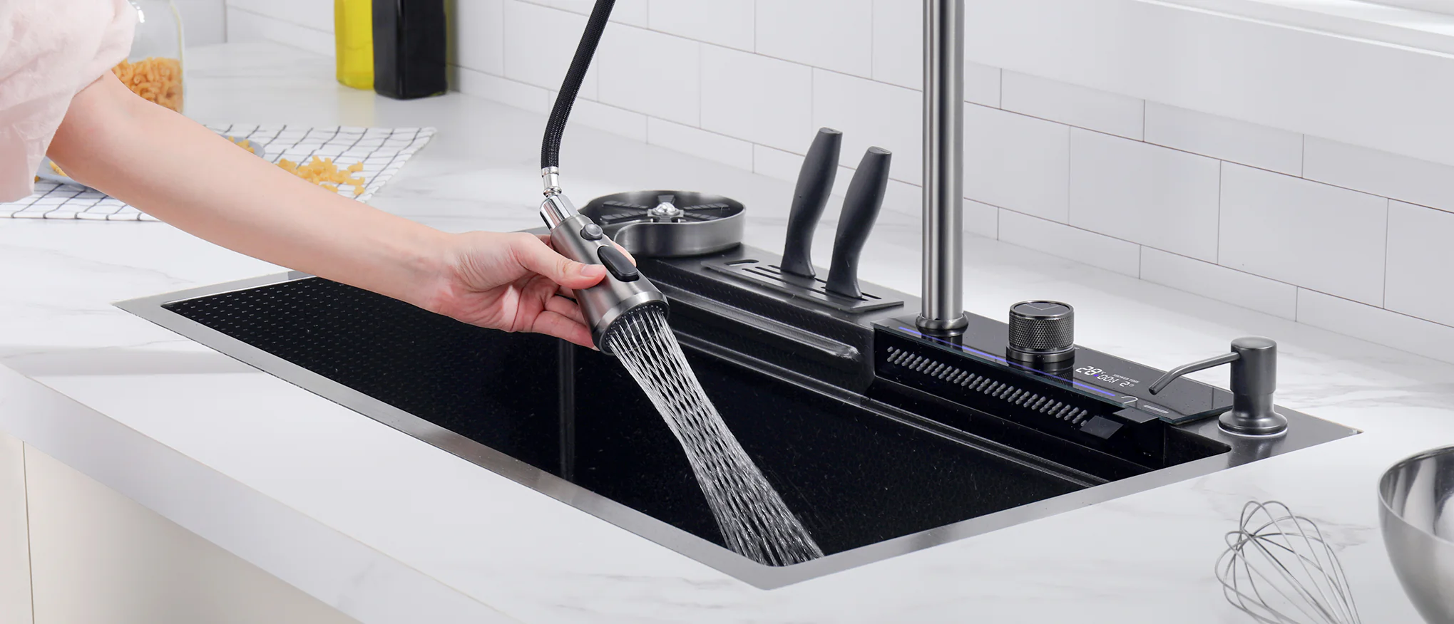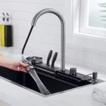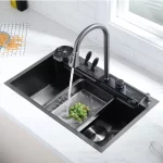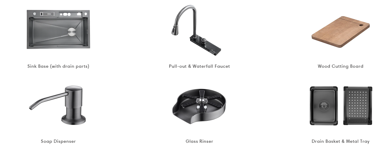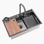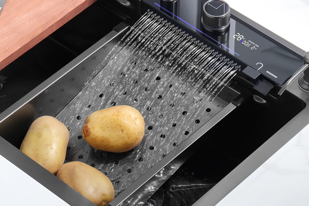 Teamed with a waterfall faucet, switch modes effortlessly using the piano button. The sink includes a drain basket and metal tray for quick, convenient cleaning.