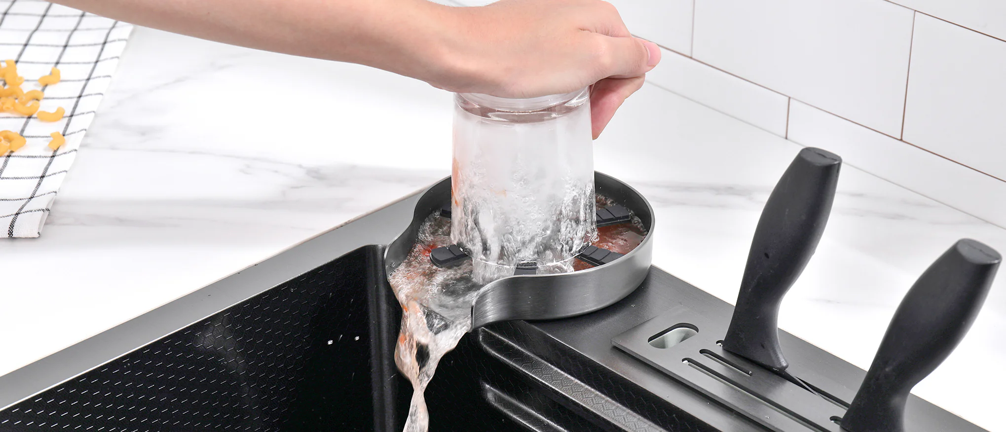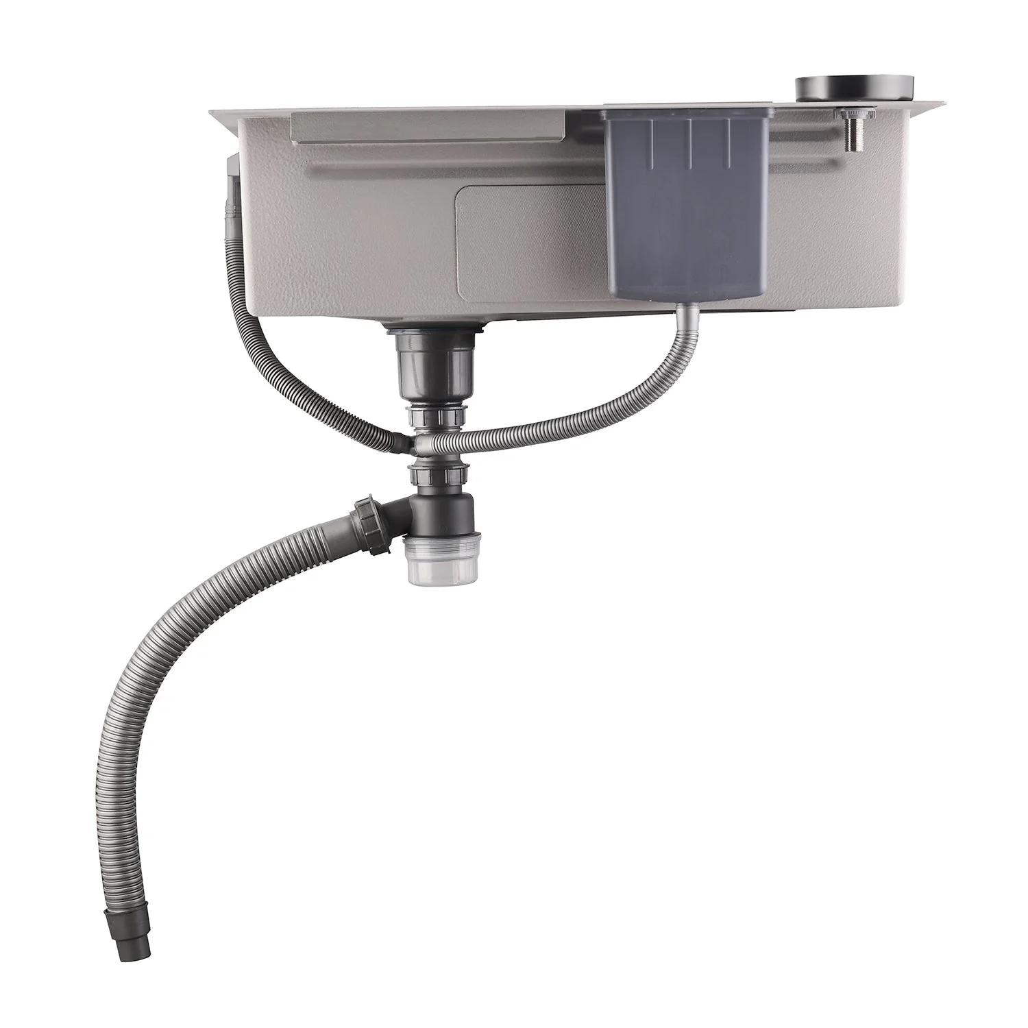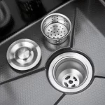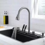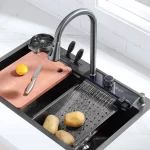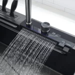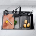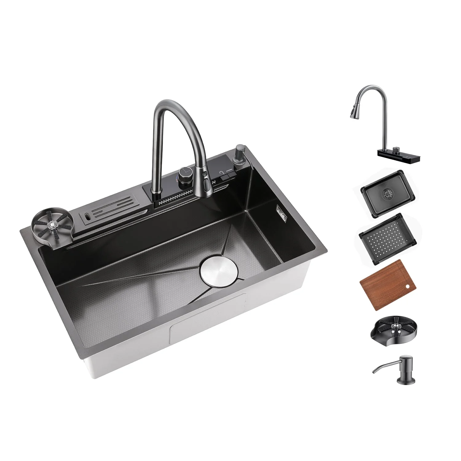 Teamed with a waterfall faucet, switch modes effortlessly using the piano button. The sink includes a drain basket and metal tray for quick, convenient cleaning.