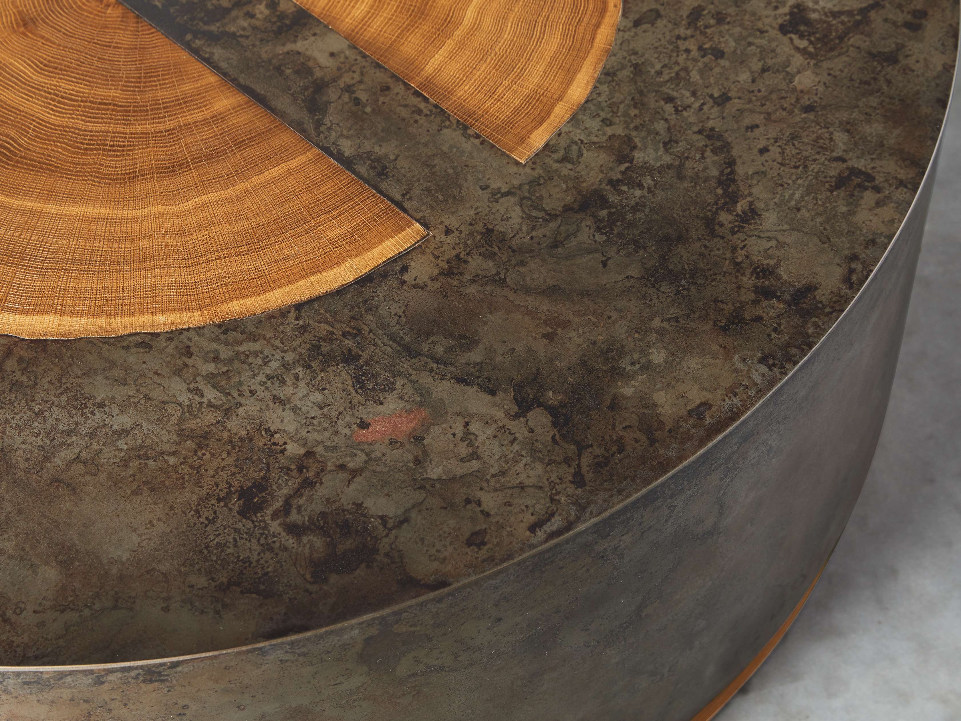 Made from panels of steel left out in the elements to age, Acacius is one of our signature collections handcrafted by a family of imaginative artists in Mexico. After developing a patina of stains and speckles, each panel is molded around the organic silhouette of reclaimed yukas, creating a finished piece as unique as the trees themselves.