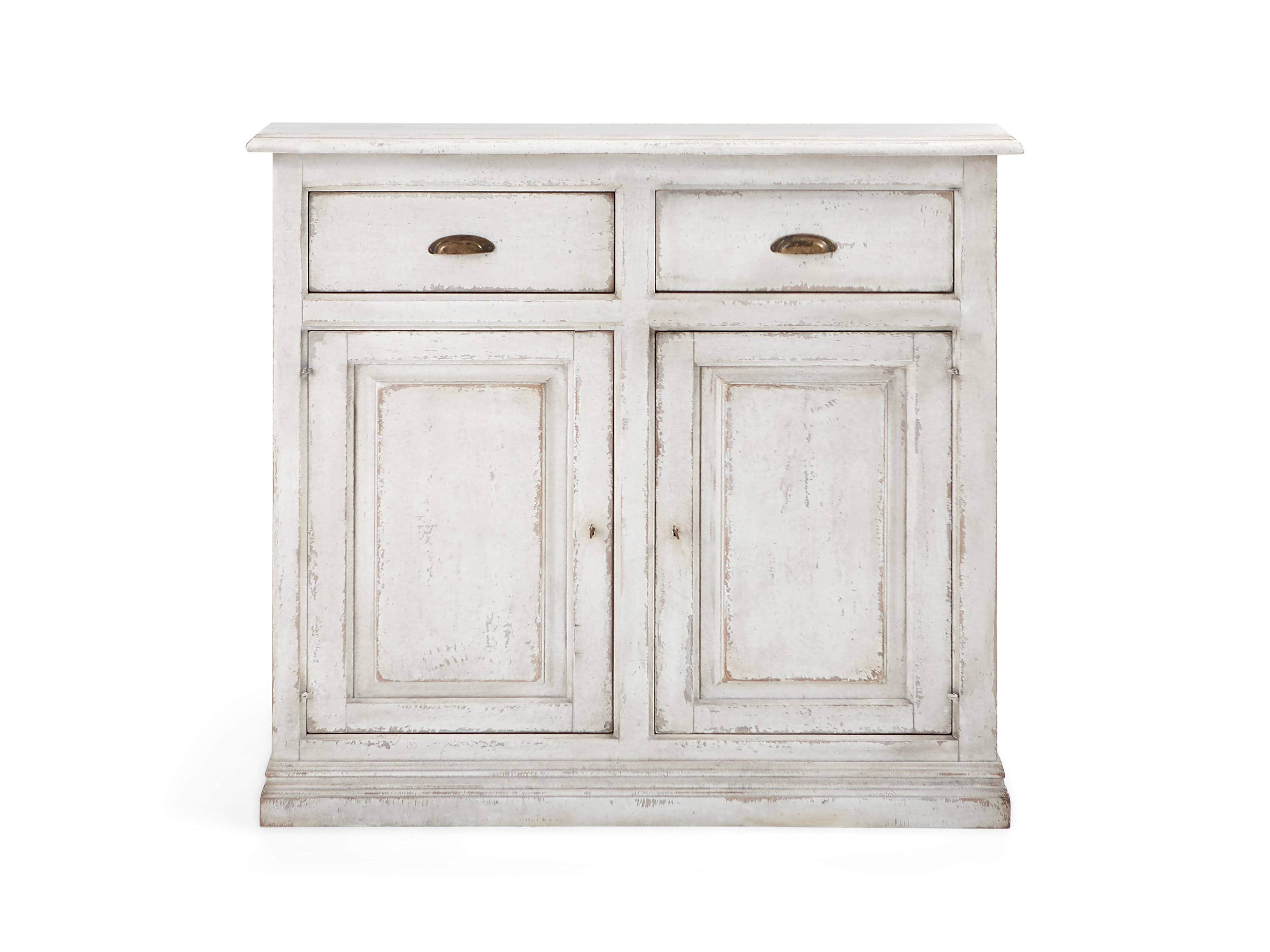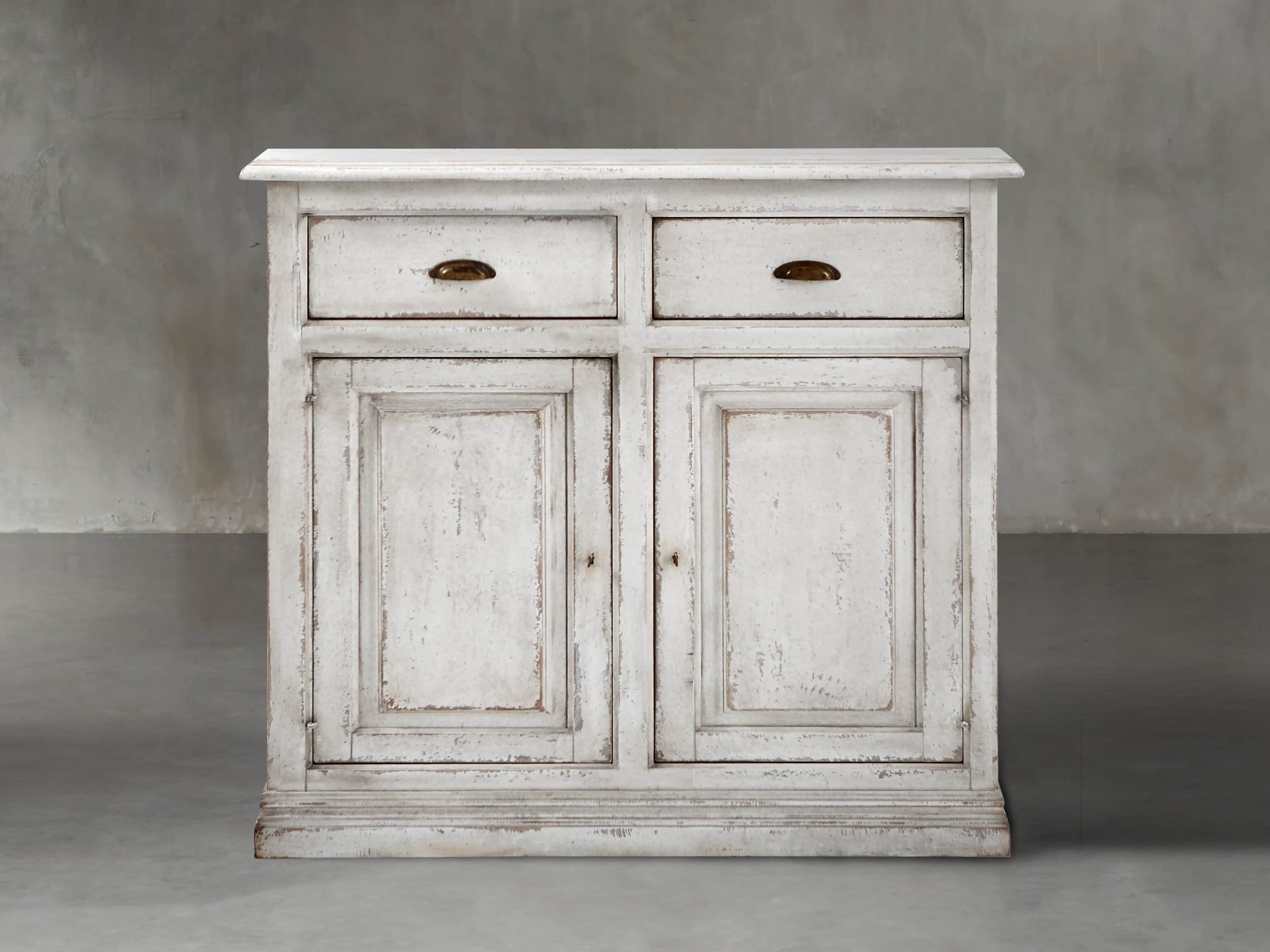 • Vintage-inspired antiqued brass pharmacy pulls and key closures accentuate cabinet doors and drawers.