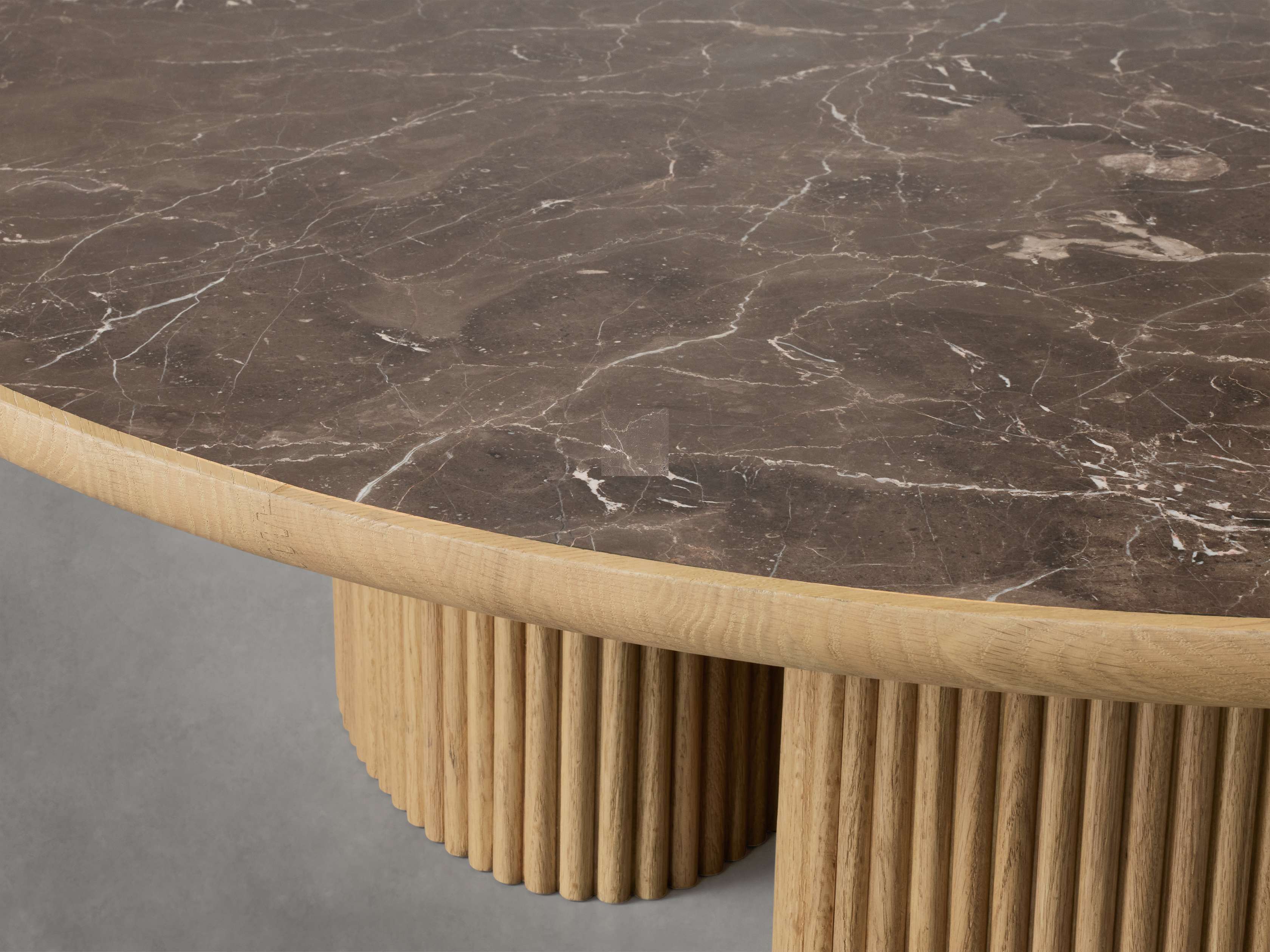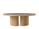 • Table bases are crafted from wood veneer and wrapped in reeds made of solid oak.