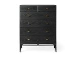 - Brass hardware features a brushed finish to complement the wood’s dark tones.