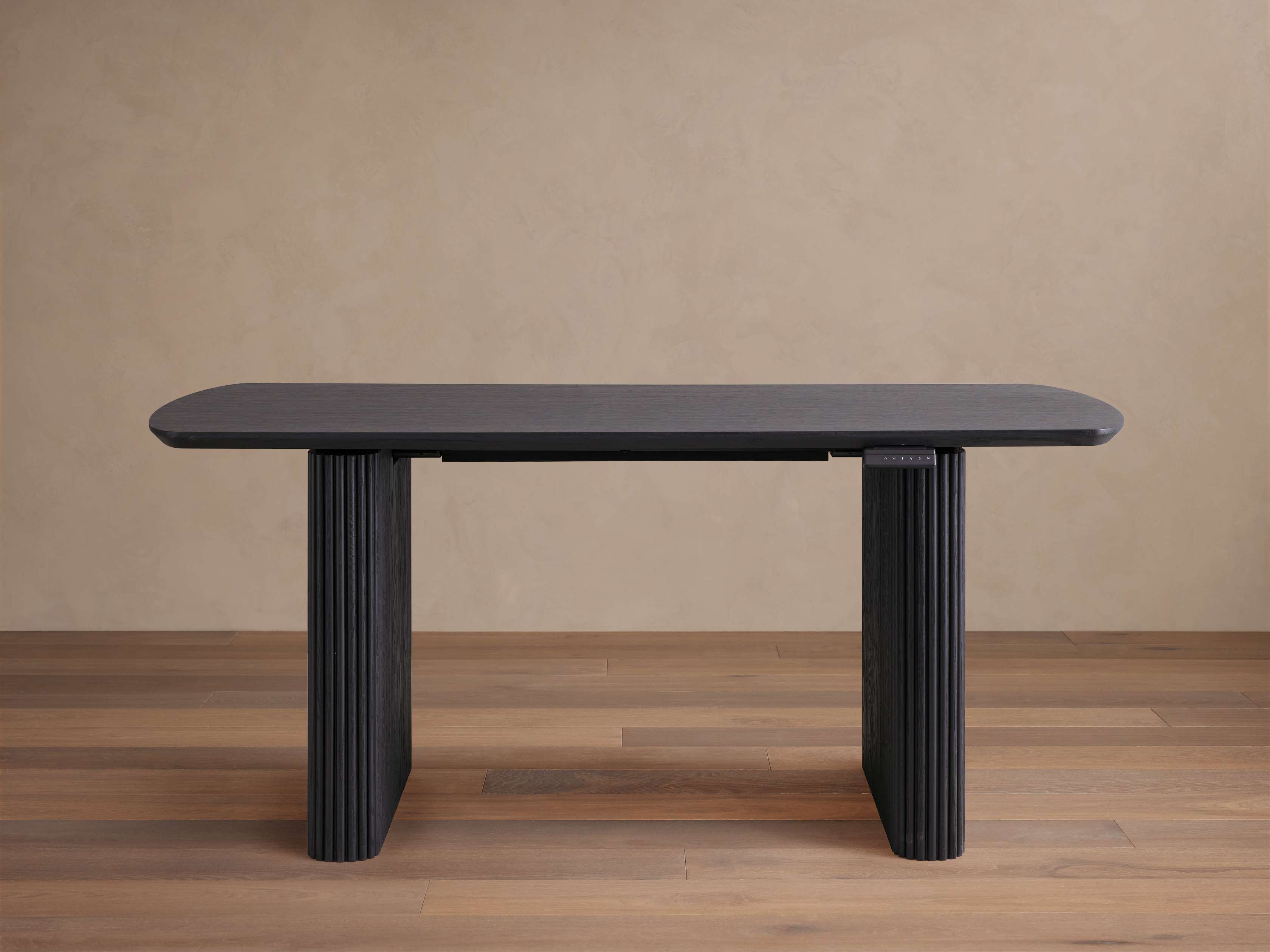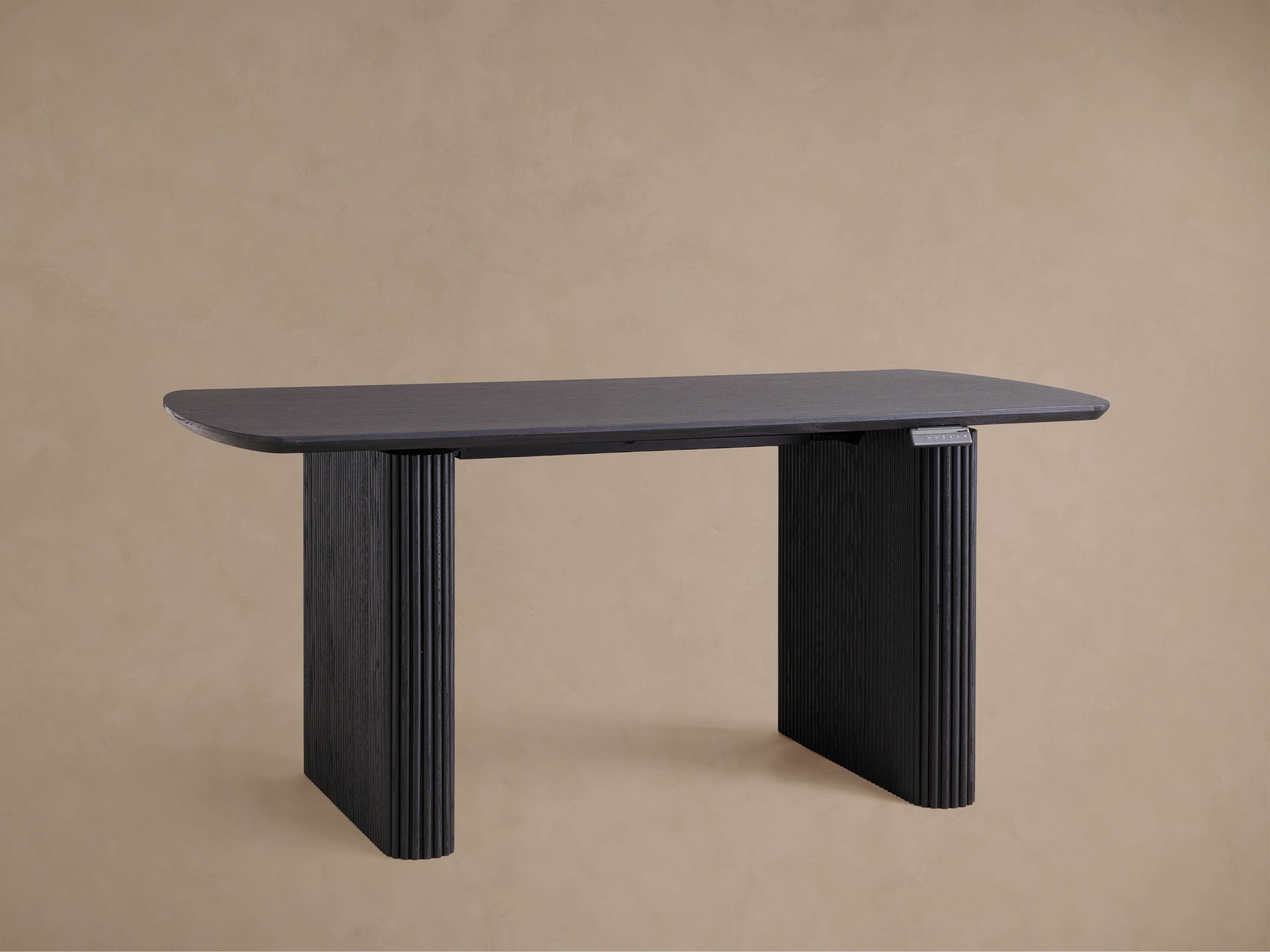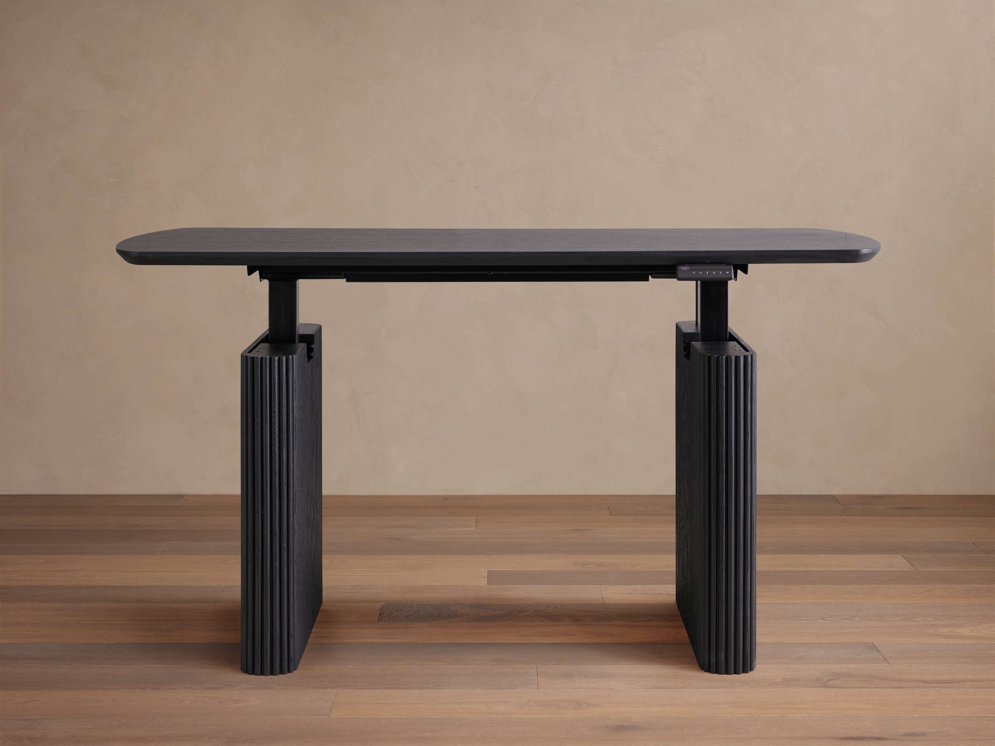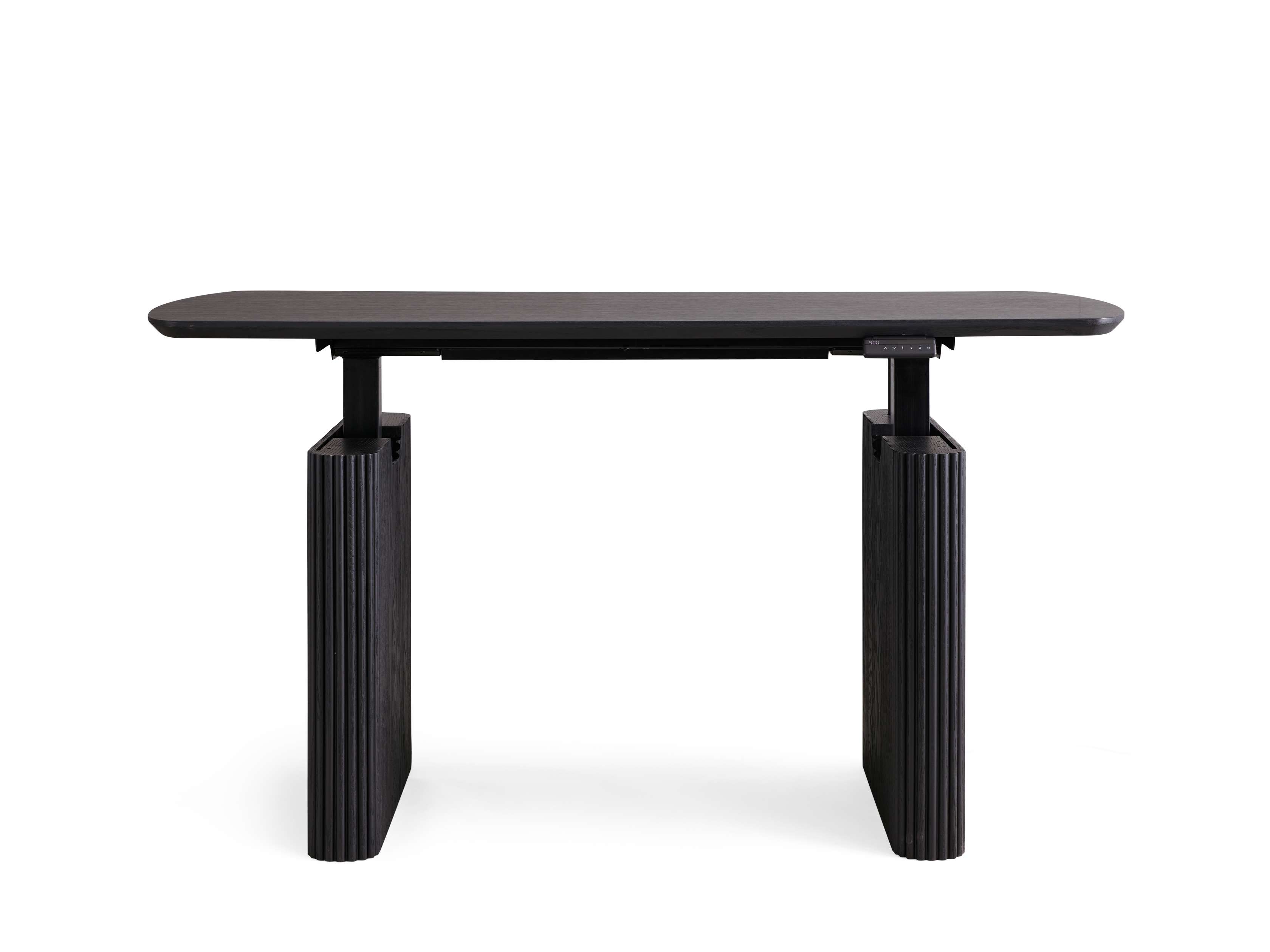 Meticulously crafted from a blend of red oak and red oak veneer, the modern silhouette of our innovative Camonte Desk Collection offers sophisticated functionality with its electric power lift mechanism. Featuring reeded detailing on the legs and the ability to be used standing or sitting with the adjustable height, Camonte offers the perfect blend of both style and function.
