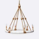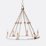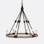 - A faux bois circle is the support for six chandelier lights anchored to a natural iron base.