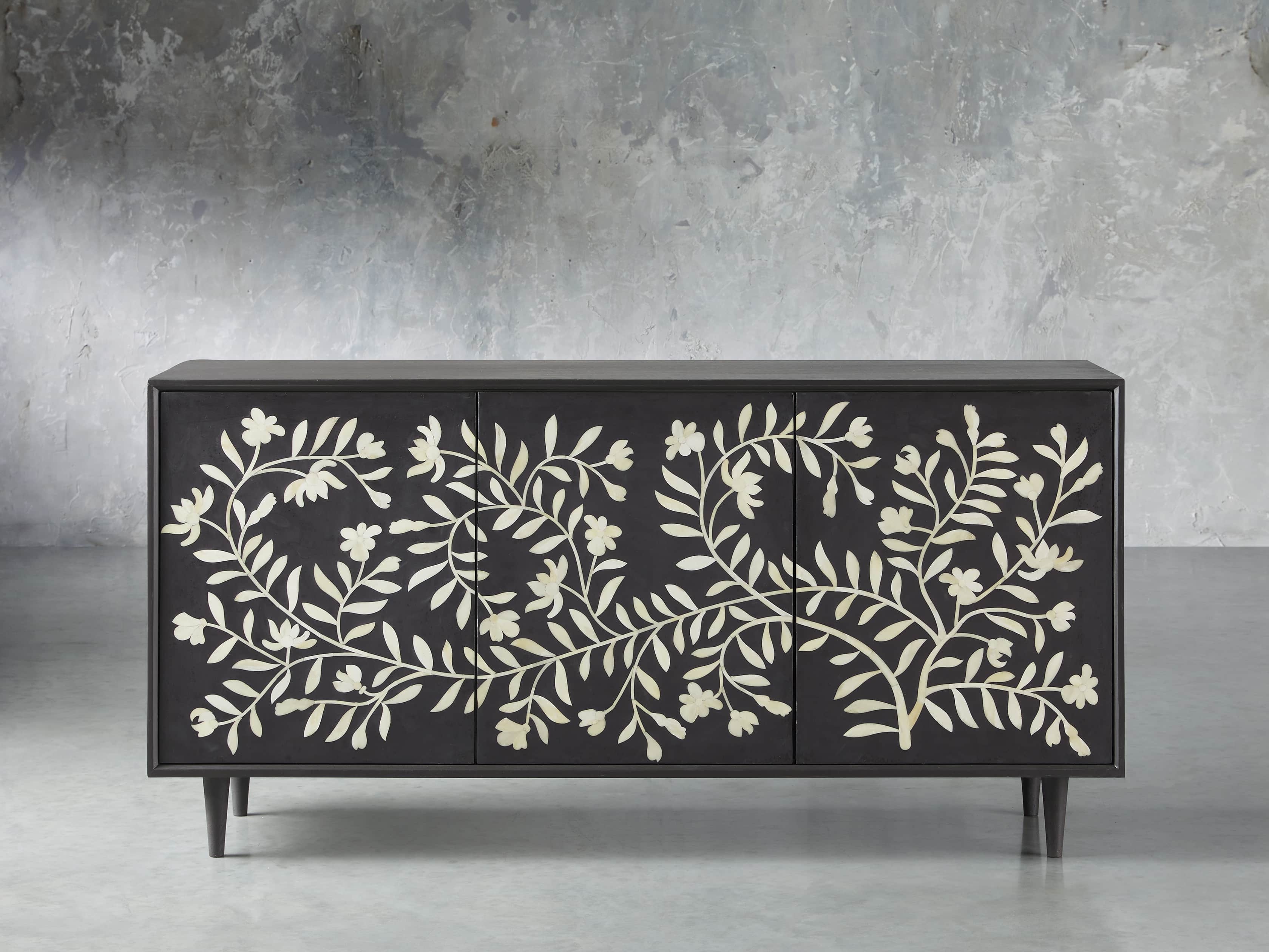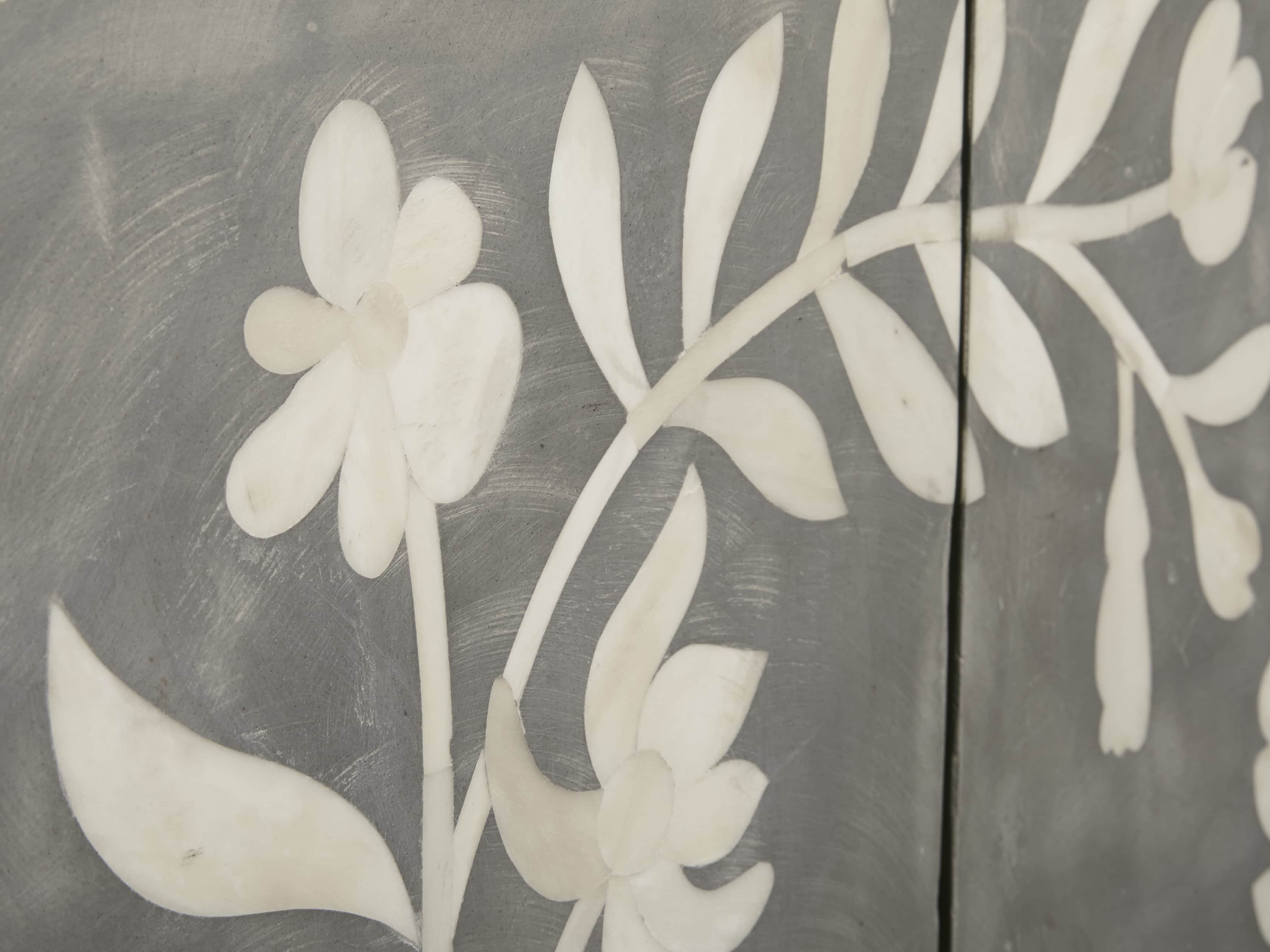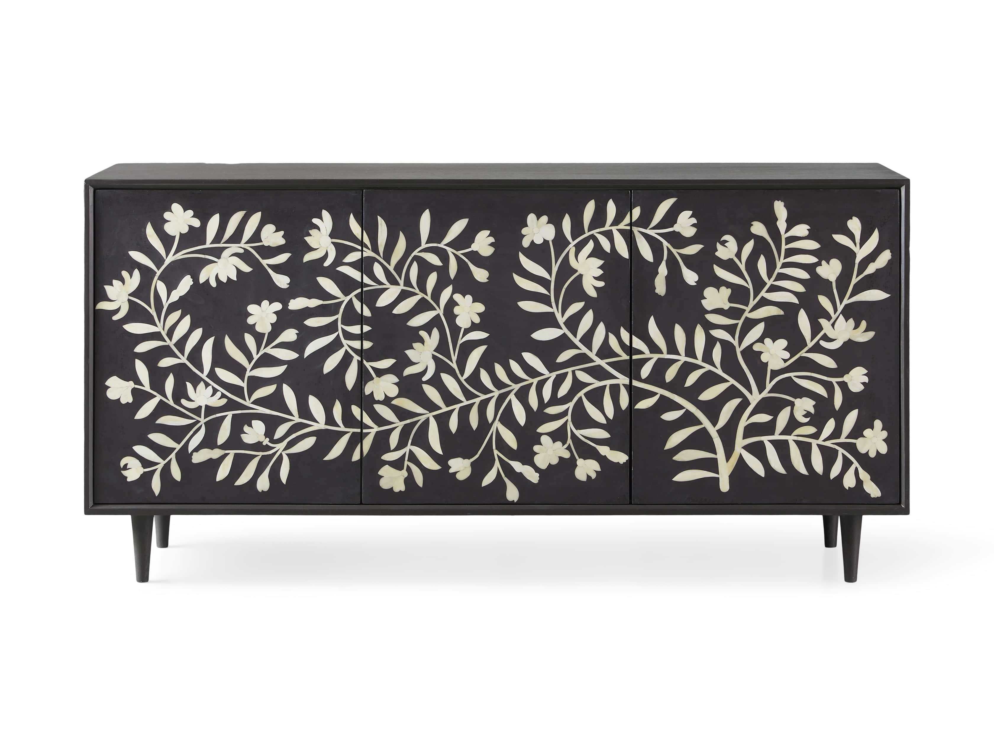 Over two years in the making, in collaboration with artisans in the remote city of Udaipur, India, our Divya sideboard is inspired by traditional designs and authentic artistry passed down from generation to generation. These modern, handcrafted case pieces feature mosaic floral motifs—hand-drawn by our designer—reminiscent of the naturally elegant jasmine found growing amongst the palaces and lakes of Udaipur. Each cabinet door takes ten days to complete, as artisans select and shape each bone by hand. As our artisans are non-violent and strict vegetarians, our bone is humanely sourced from naturally deceased water buffalo that roam the streets and countryside of India.