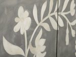 - Resin is poured over cabinet doors, securing inlays to the sideboard’s surface and providing contrast to accentuate the elegant floral motif.
