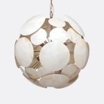 - Large discs of luminous kabibe shell replace the style’s typical spheres, and varying dimensions and diameters create a dynamically abstract feel.