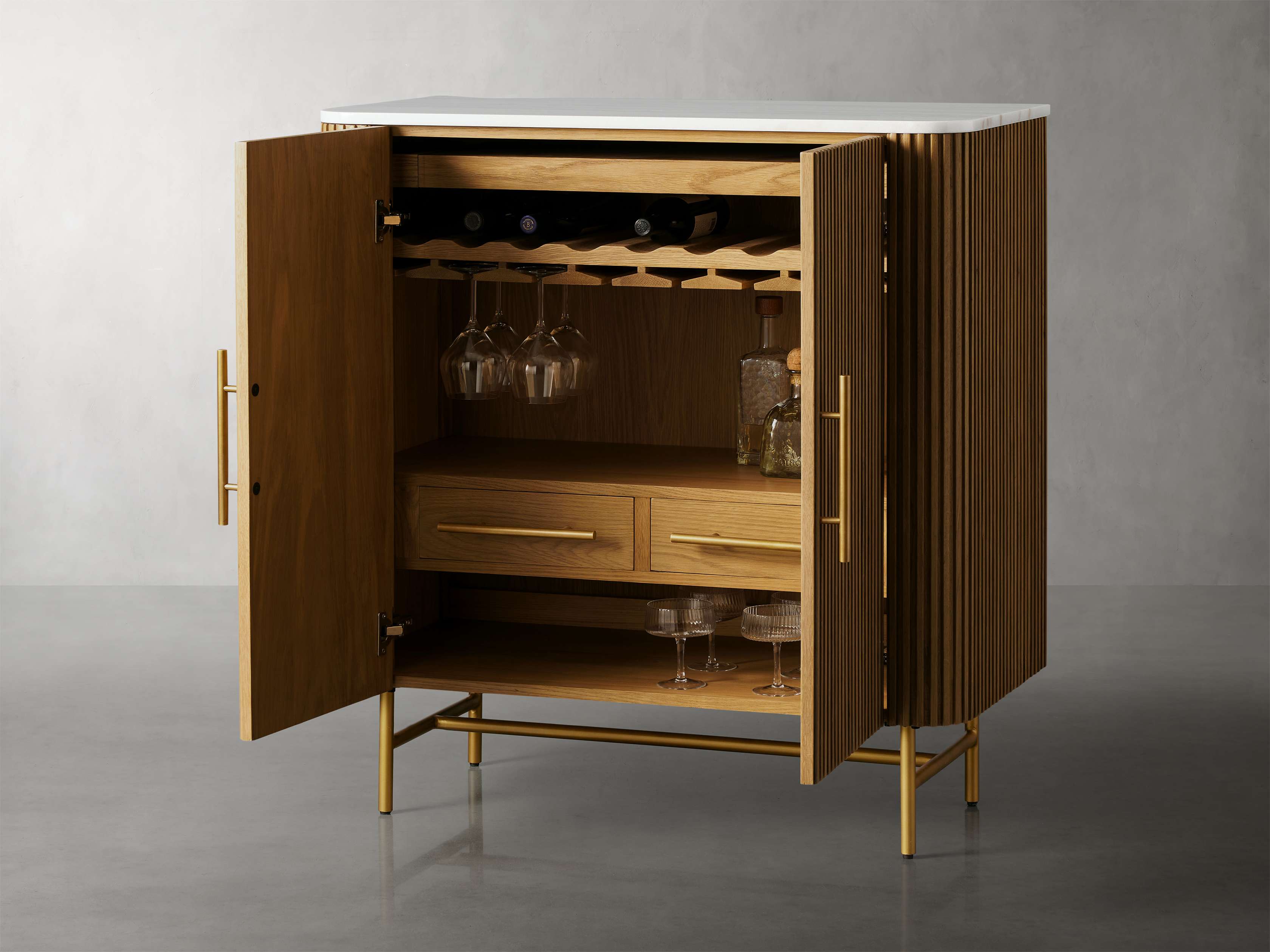 - Bar includes built-in wine bottle and glass storage space in addition to a shelf and two interior drawers.