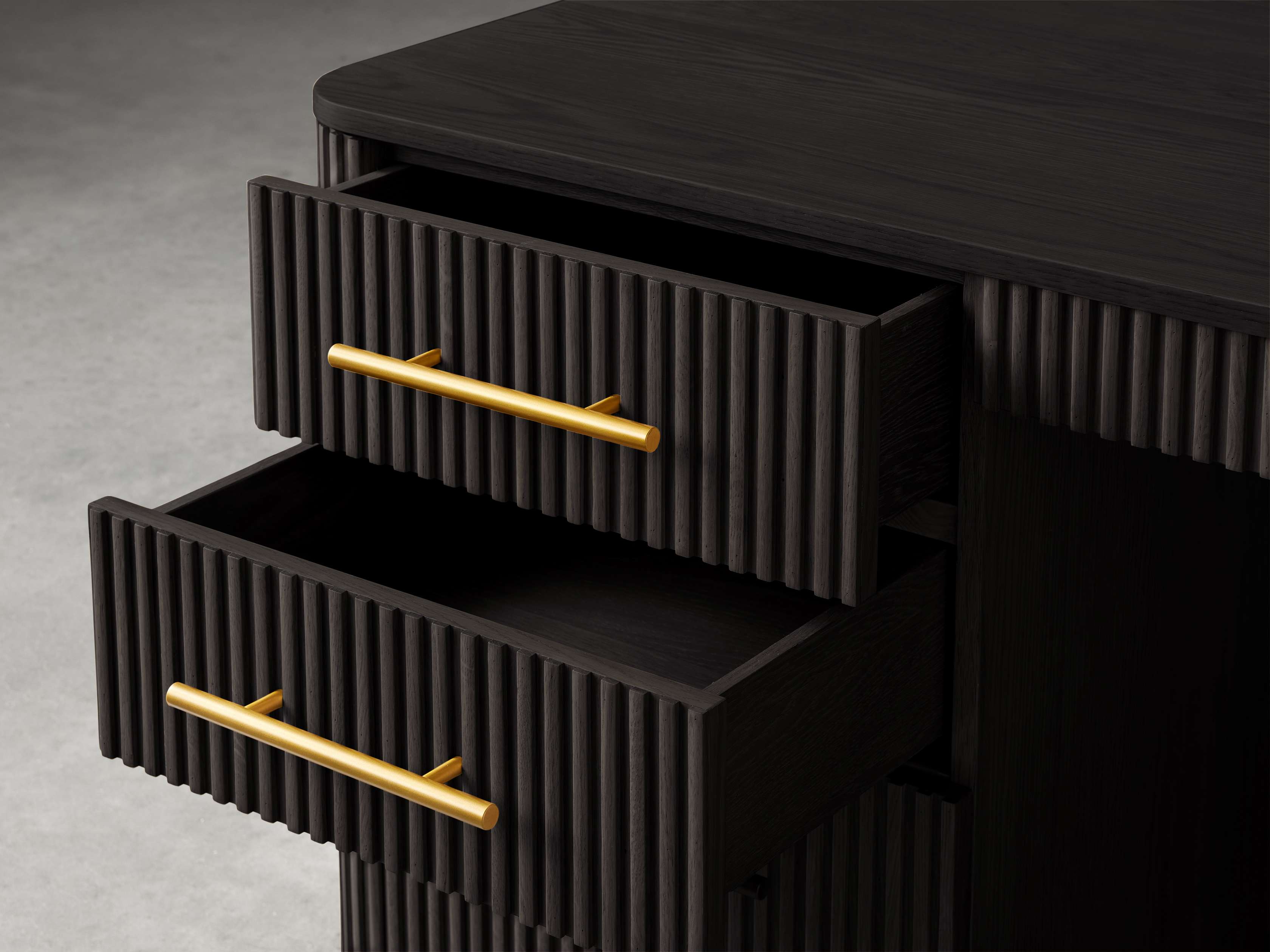 - Hand-stained finishes on reeded wood surfaces include a protective lacquer coating for subtle sheen.