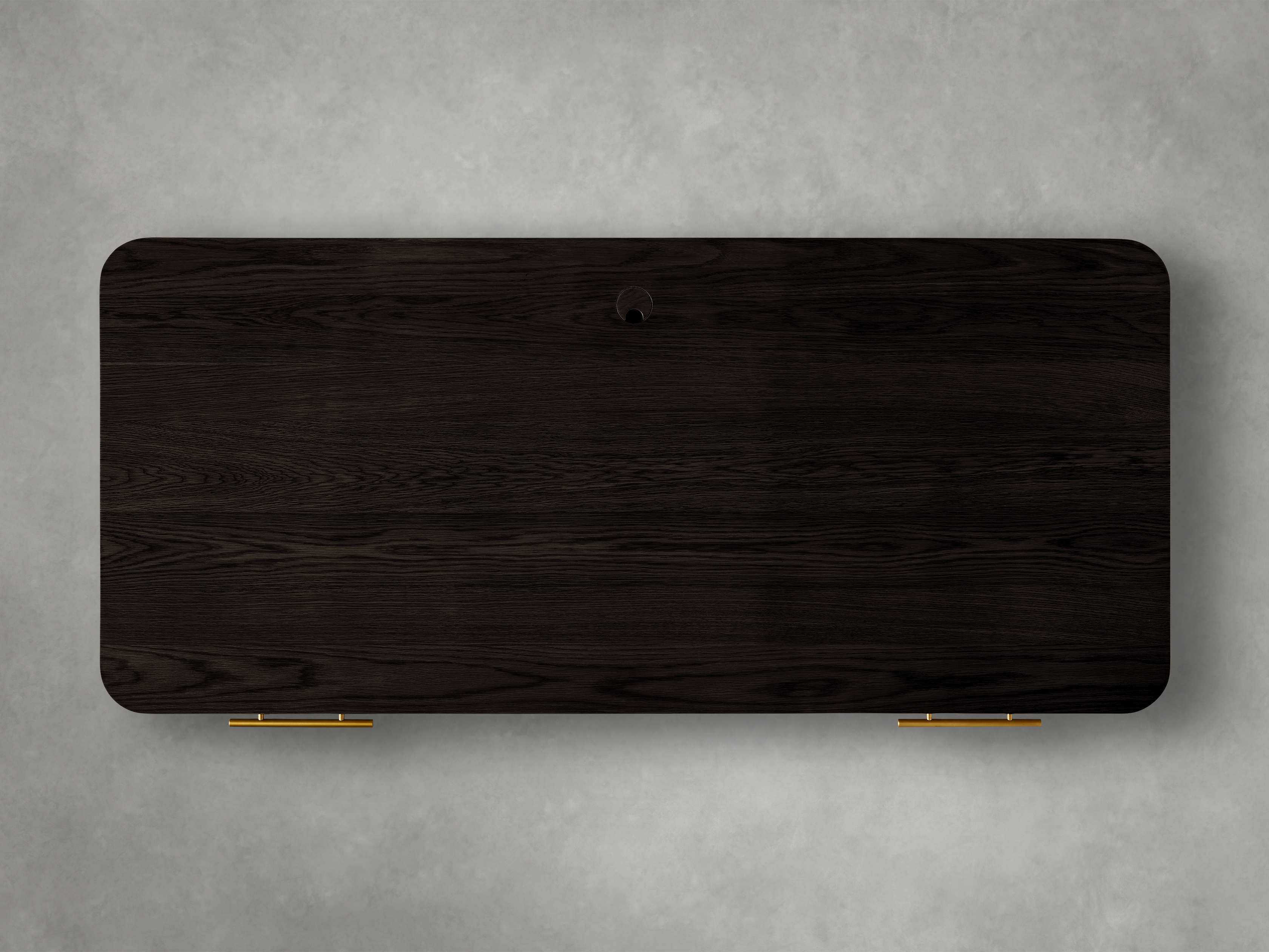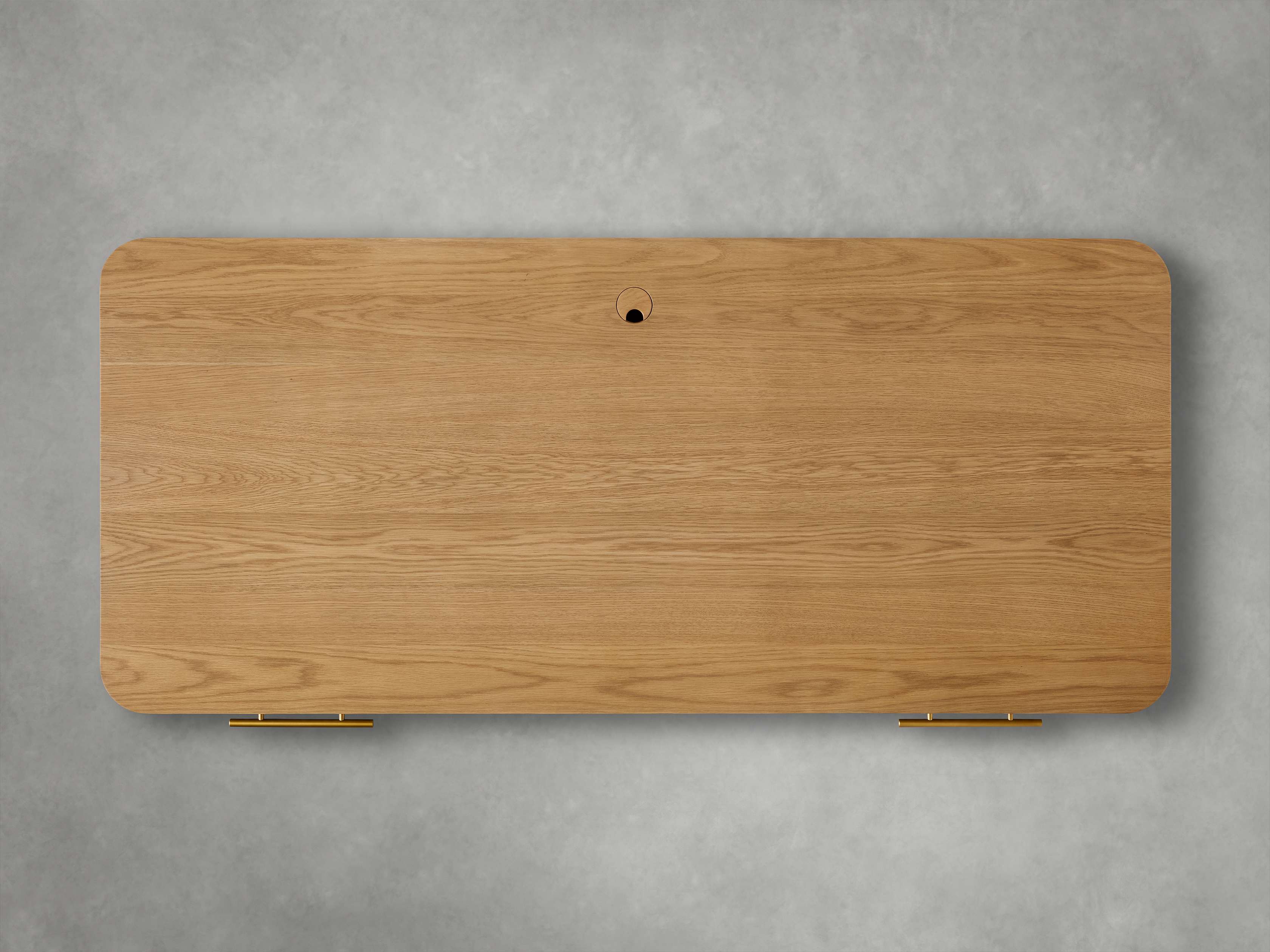 - Zinc-alloy finger pull hardware on the center drawer features a light brass finish.