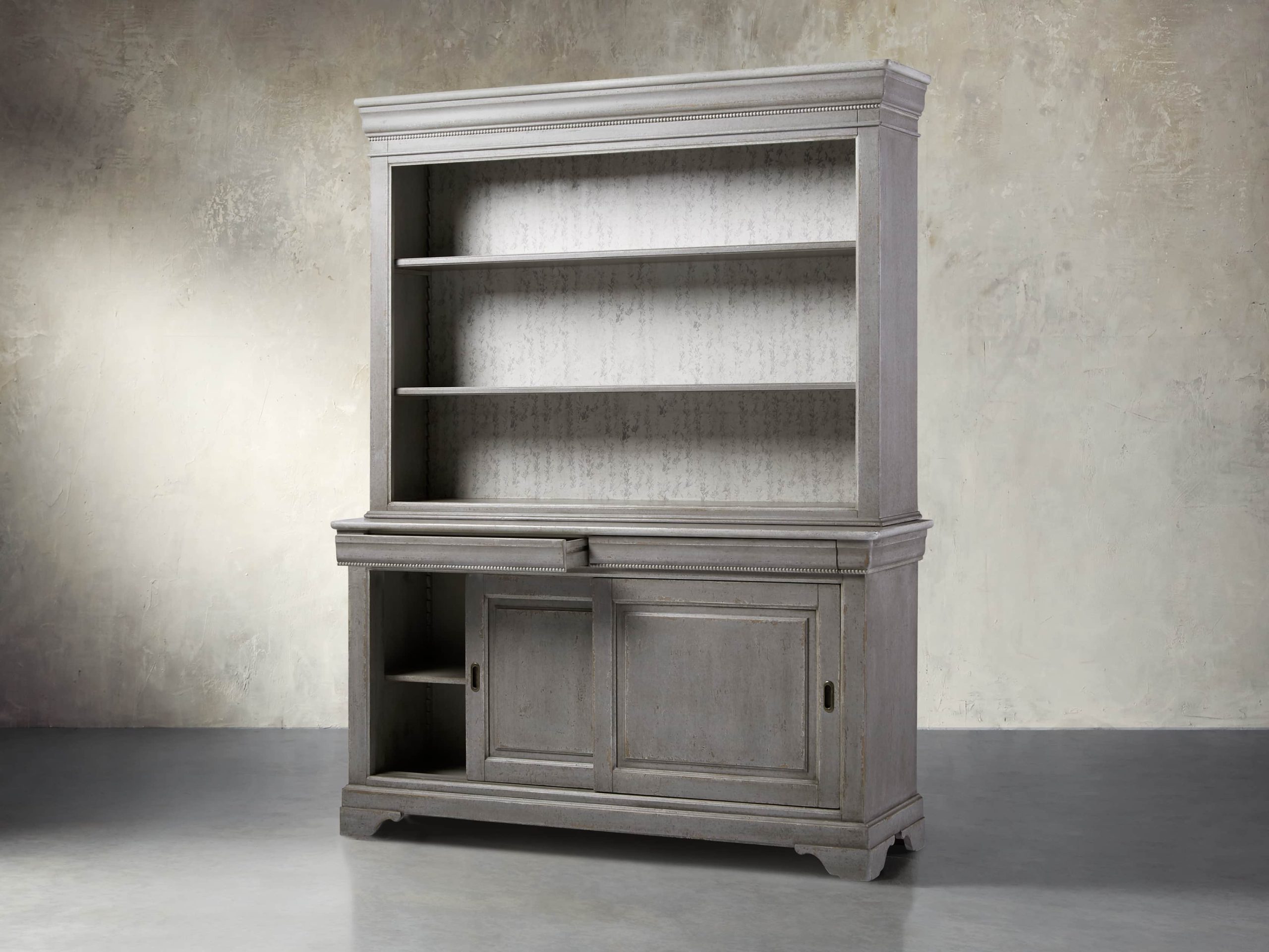 • Hand-applied Antique Grey finishes are layered with stain, paint, and glaze to achieve a timeworn appearance with elegant detailing.