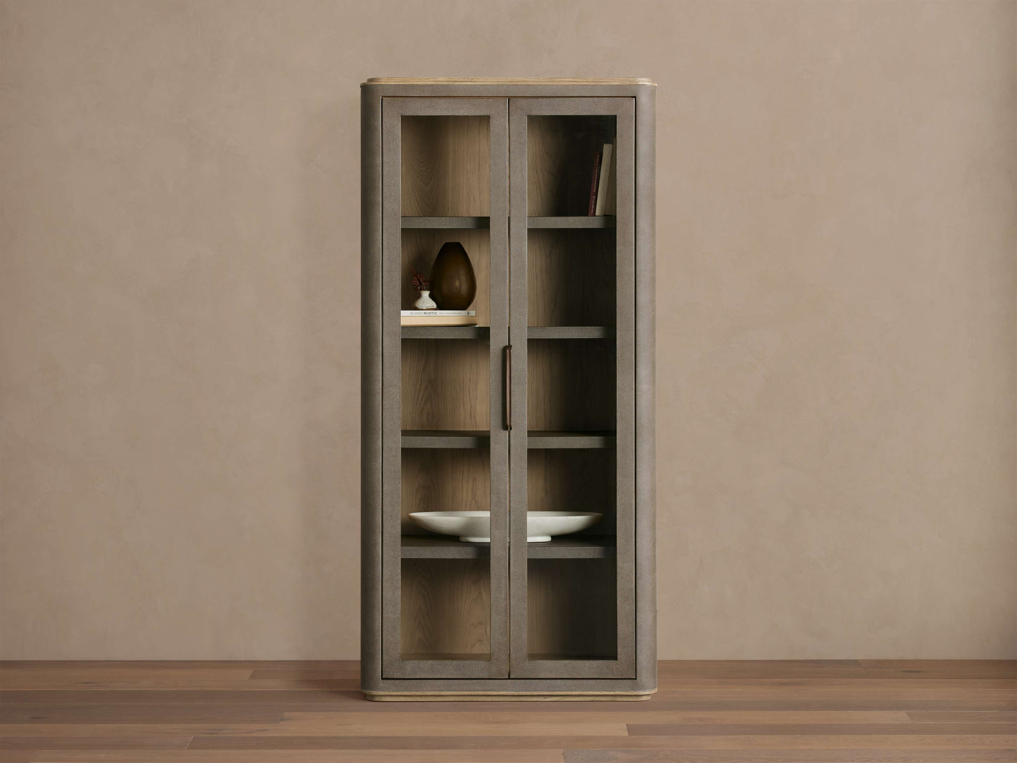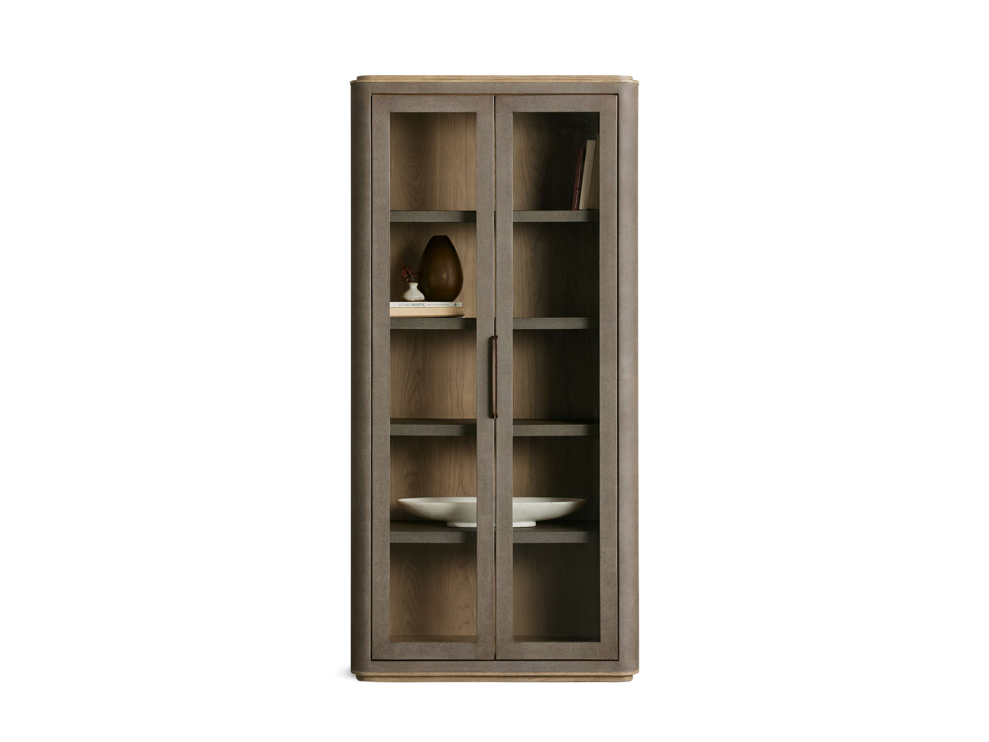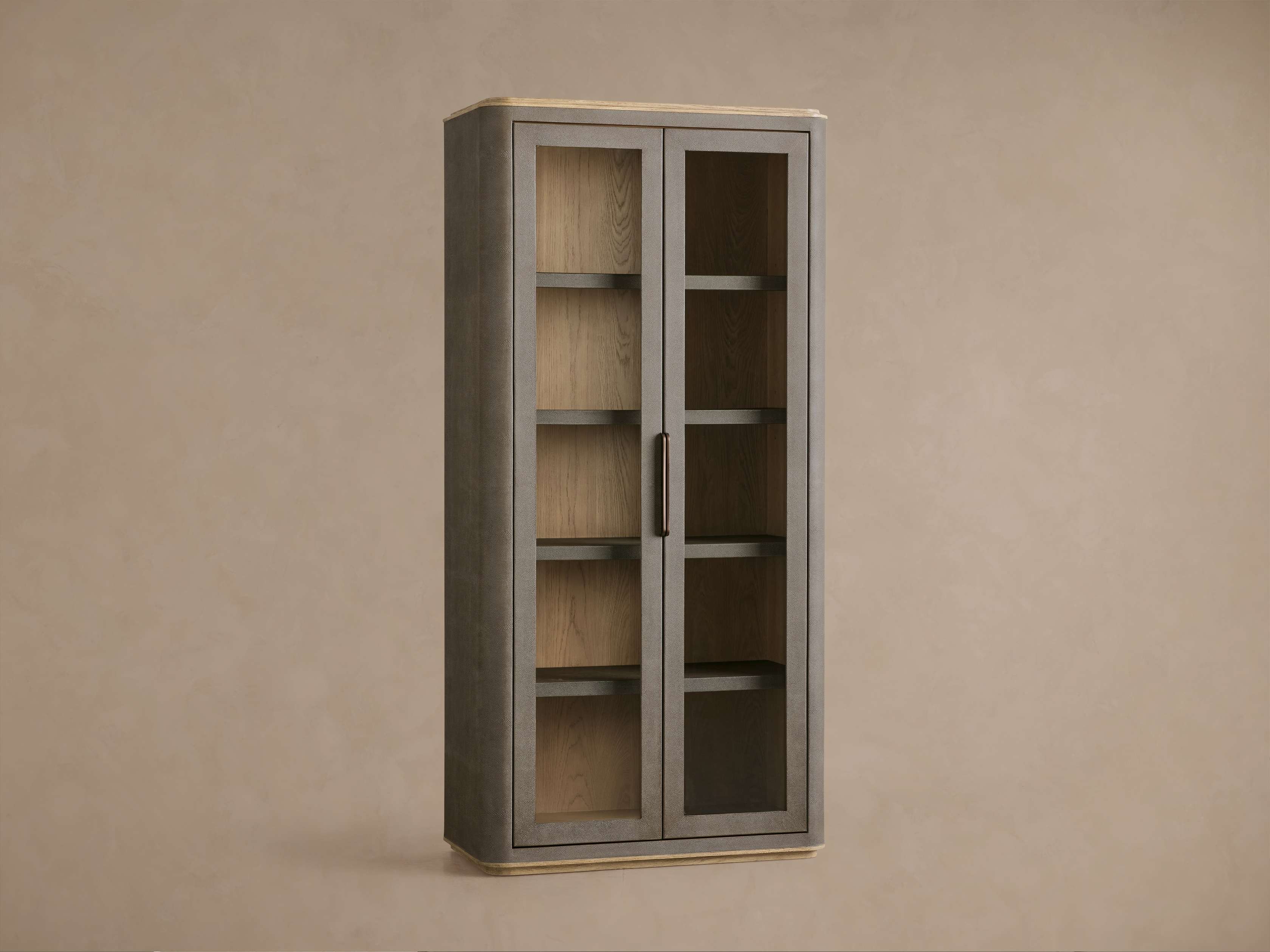 Balancing soft curves with rich materials, our Harrow Collection celebrates both modern form and timeless elegance. Softened by rounded edges, Harrow��s refined silhouettes are artisan-crafted from oak wood wrapped in faux shagreen for subtle texture. A recessed wood base offers beautiful contrast while creating a unique floating effect.