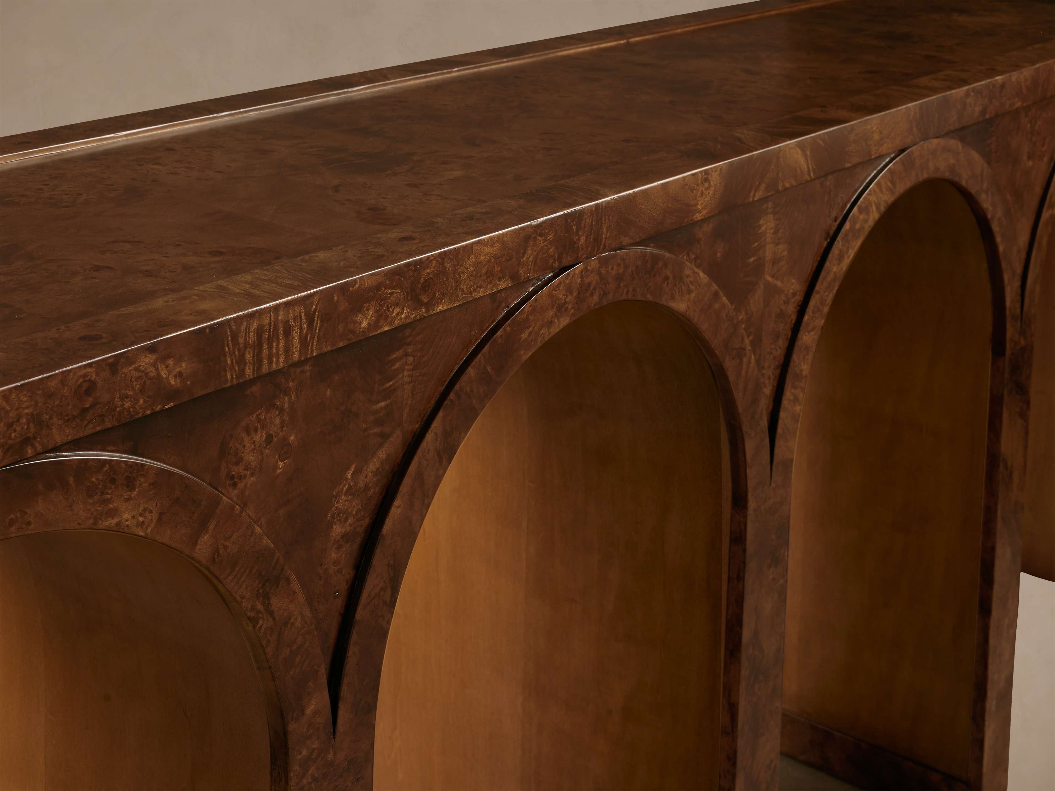 Where gentle curves meet the natural graining of illuminating burl wood, our artisan-crafted Hattie Collection awaits. With its distinguished arches paired with rich finishes, Hattie brings architectural interest to any space.