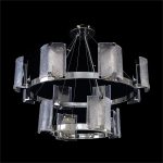 - A two-tiered ringed metal frame in a Polished Nickel finish supports twelve lights, beautifully diffused through curved shades of textured clear glass