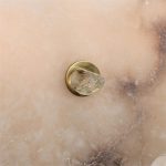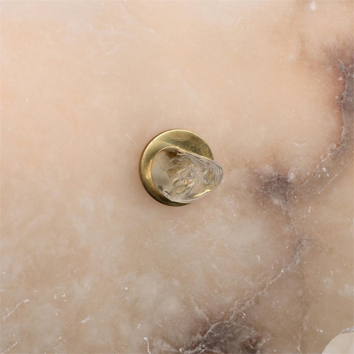 - The piece is adorned in a layered cluster of alabaster stone affixed with brass accents, displaying rich textural forms that create a bold dimensional statement.