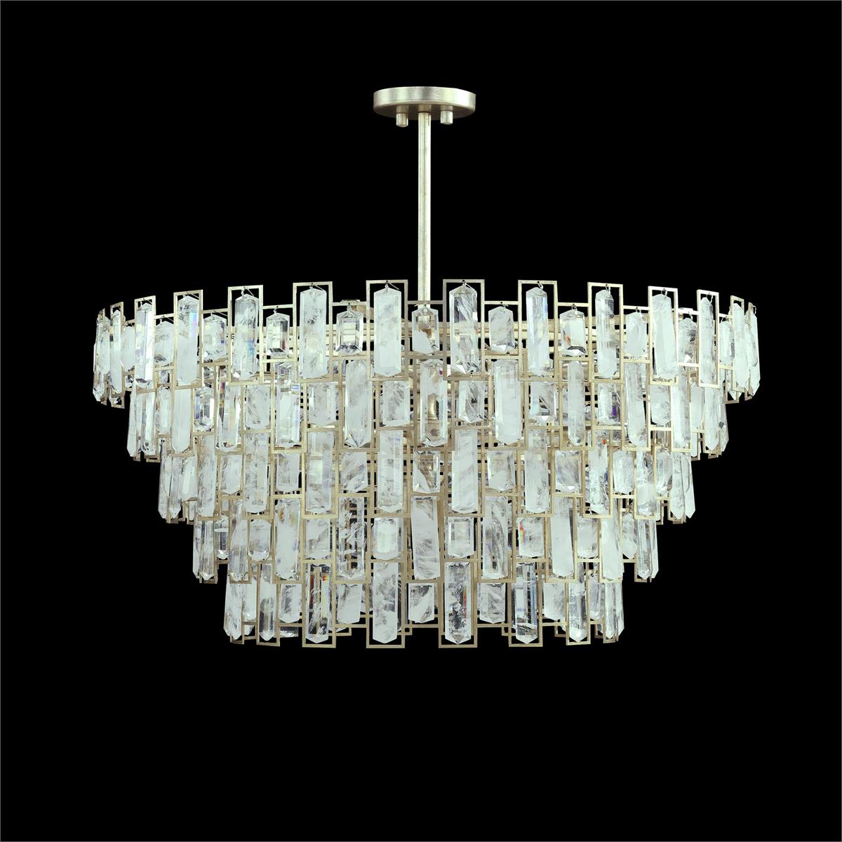- The crystals are mounted to a geometric steel frame finished in Light Champagne Silver Leaf, displaying a pattern of alternating rectangles that adds rich depth to the design.