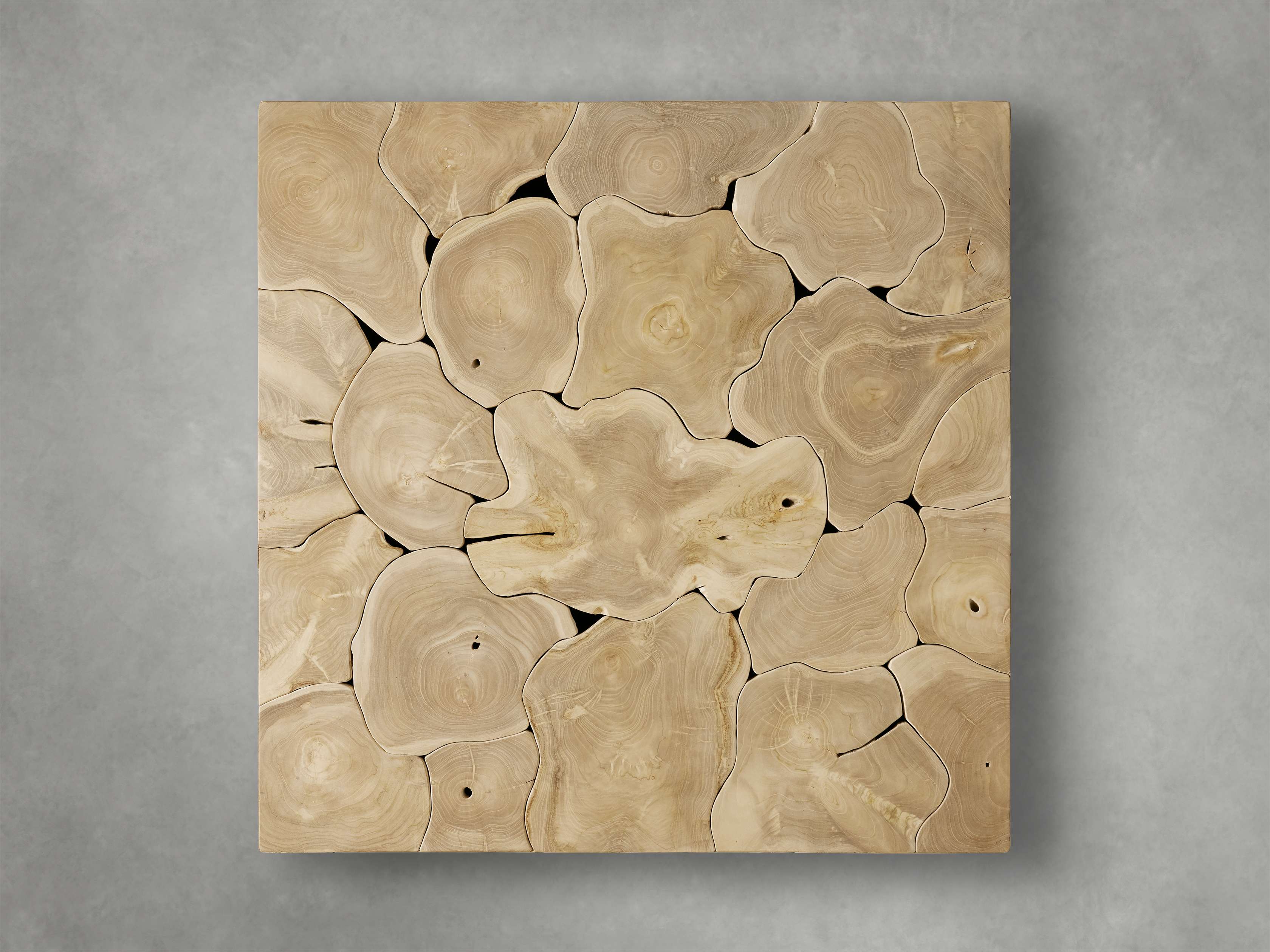 Masterfully handcrafted by our artisan partners in Indonesia, our Kalmar Collection is thoughtfully pieced together from slices of teak heartwood and sapwood affixed to solid wood frames. Each hand-cut section of teak is carefully sanded, smoothed, waxed, and sealed by hand to enhance its natural variations in wood tones, grain patterns, texture, and shape—making it truly one of a kind.