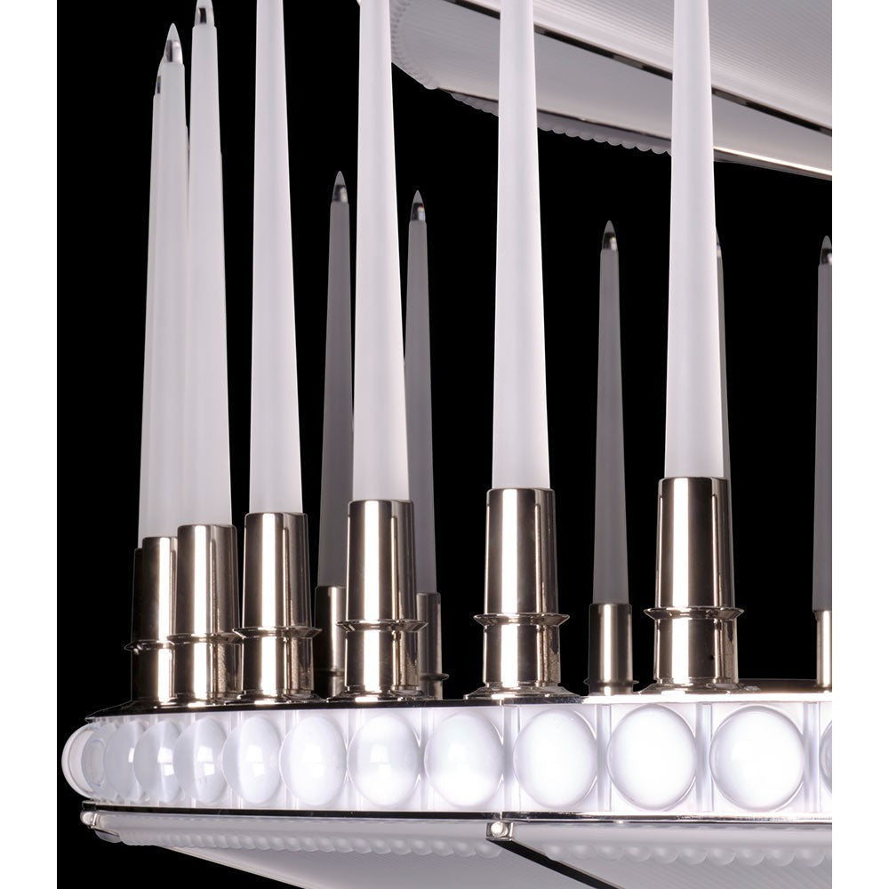 - Carved with stripes and cabochons with the satin finish emblematic of Lalique, the crowns of light are adorned with slender crystal candles, arranged in a rhythmic rigor.