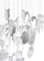 • Ceiling lamp with handmade white porcelain leaves falling in a cascade 1.1 meters on a fiber optic with subtle points of light.