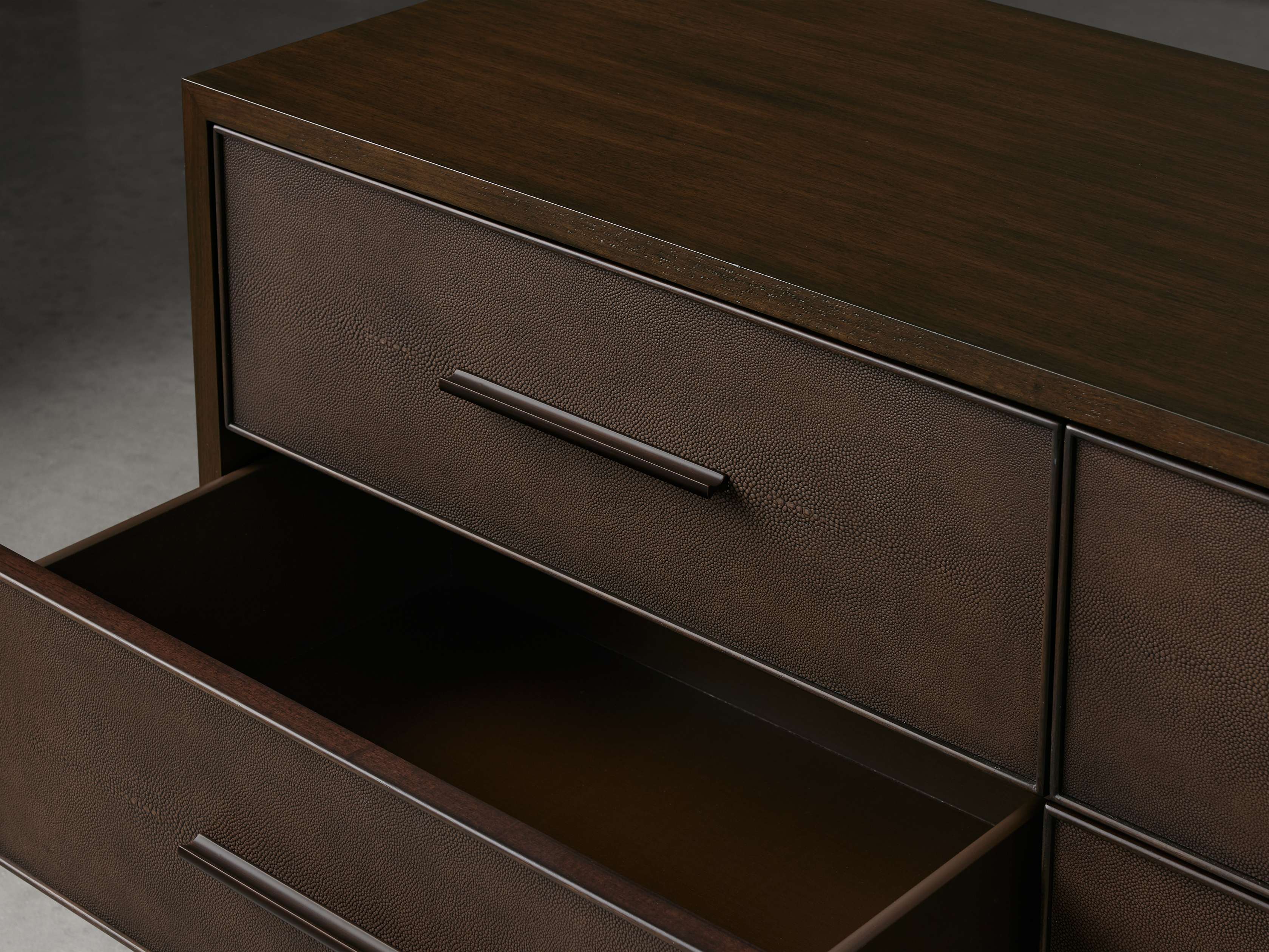 • Reconstituted leather insets are dyed and artfully embossed with textural shagreen detailing.