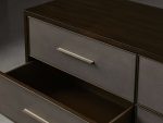 Featuring a sleek aesthetic, our Malone collection is artisan-crafted from solid parawood or oak wood—depending on your preferred finish—and surfaced with walnut or elm wood veneers. Insets made from reconstituted leather embossed with a shagreen pattern are complemented by hand-applied finishes to give this collection a modern look with intriguing textural details.