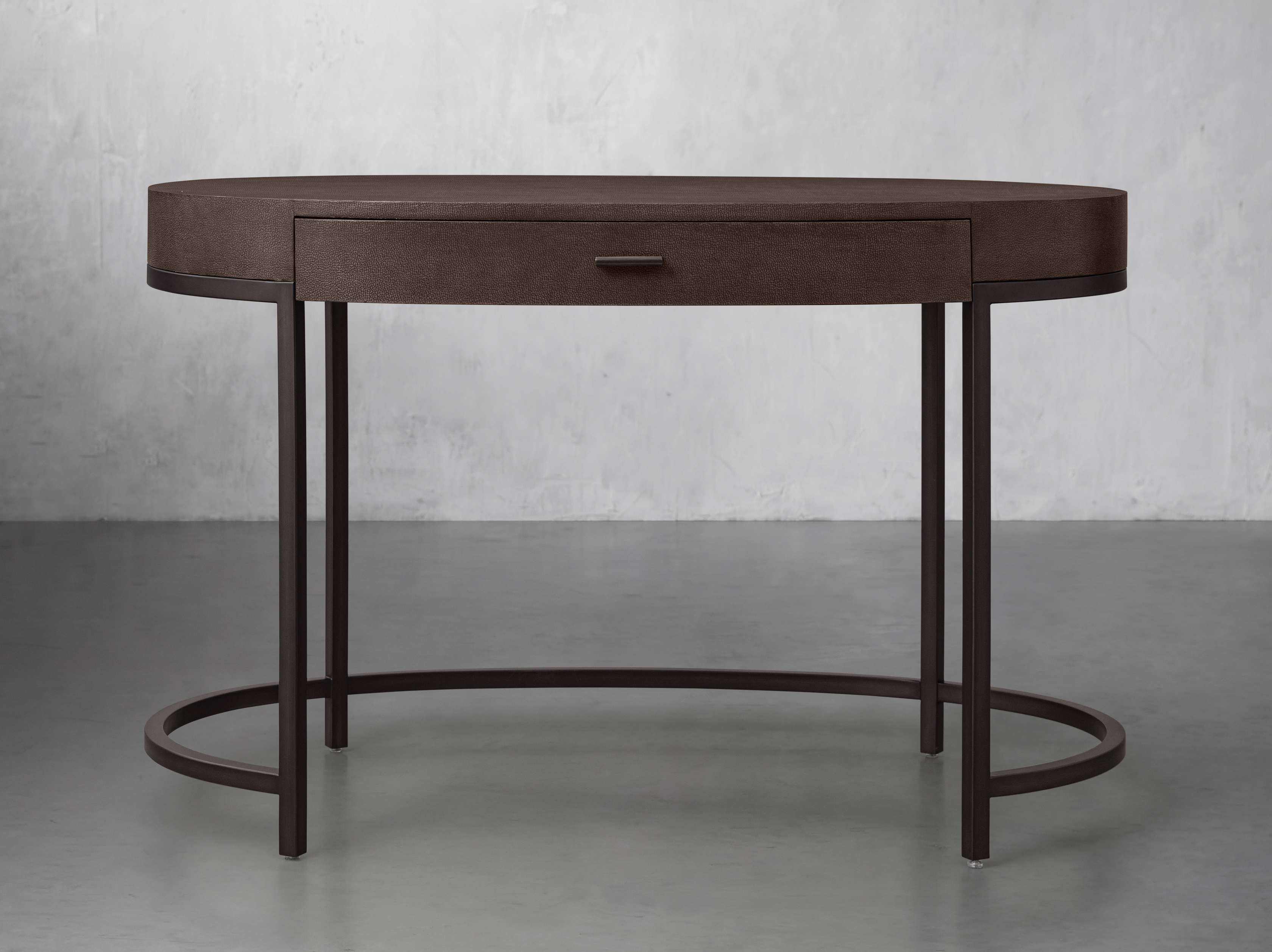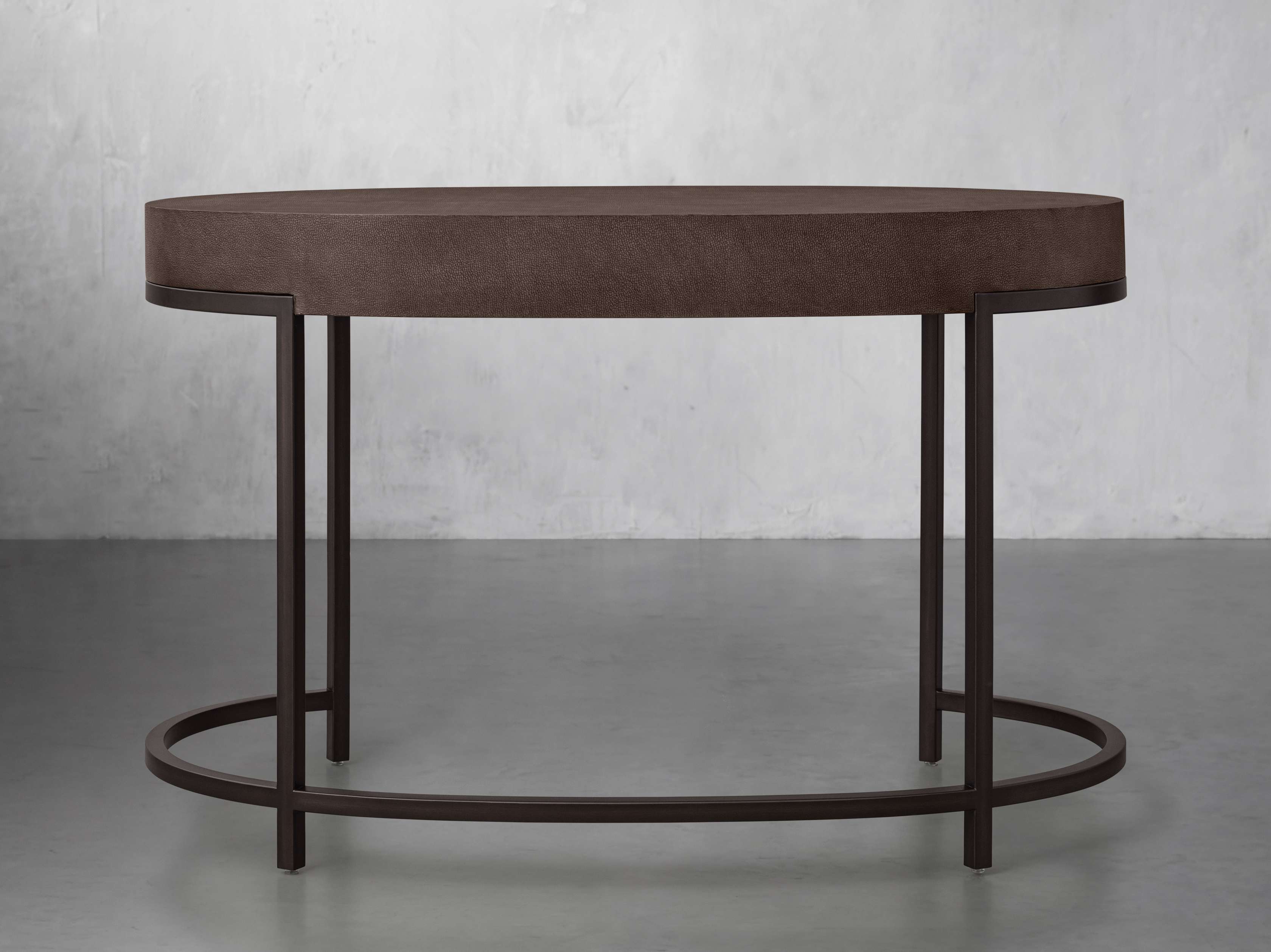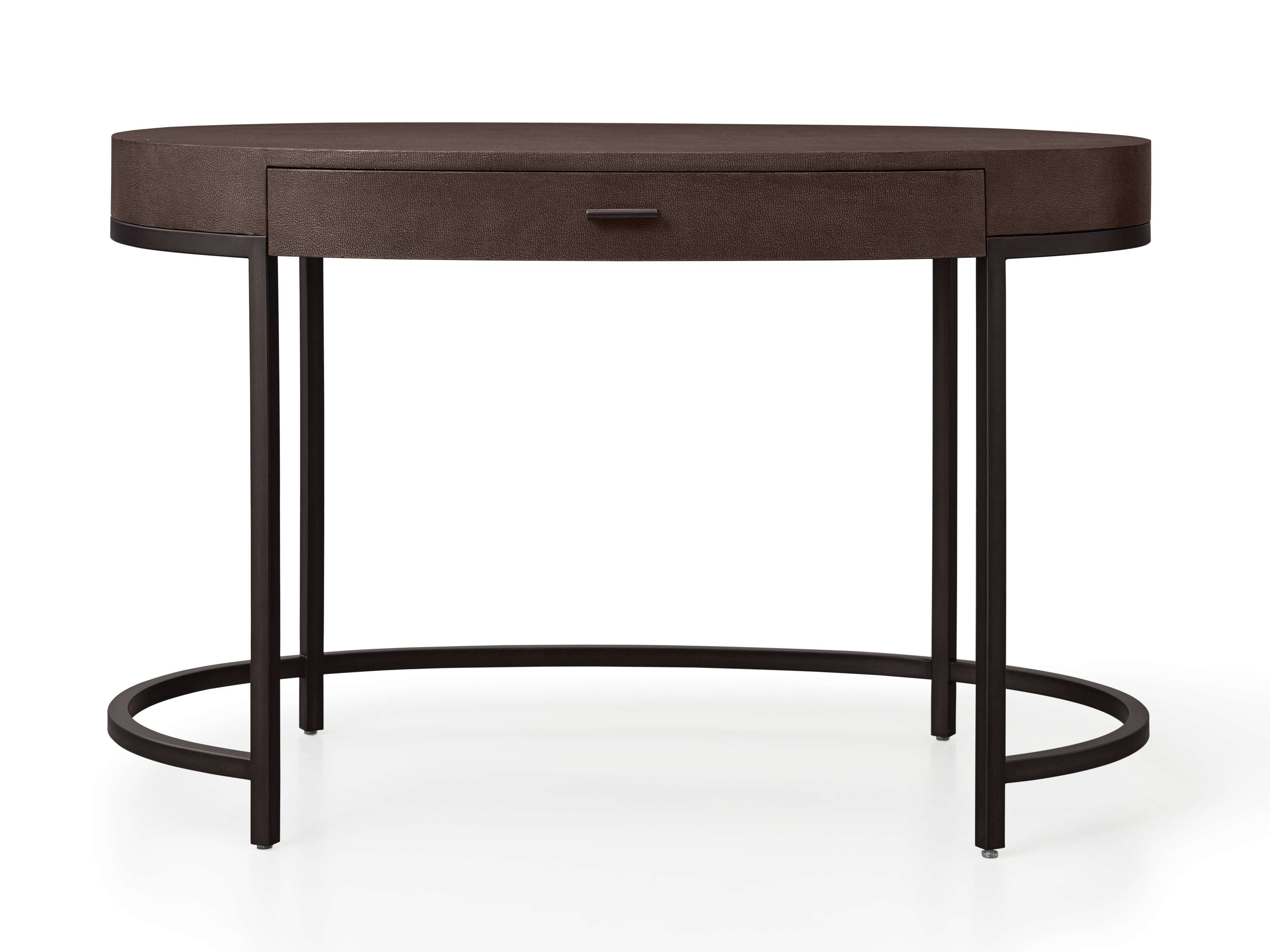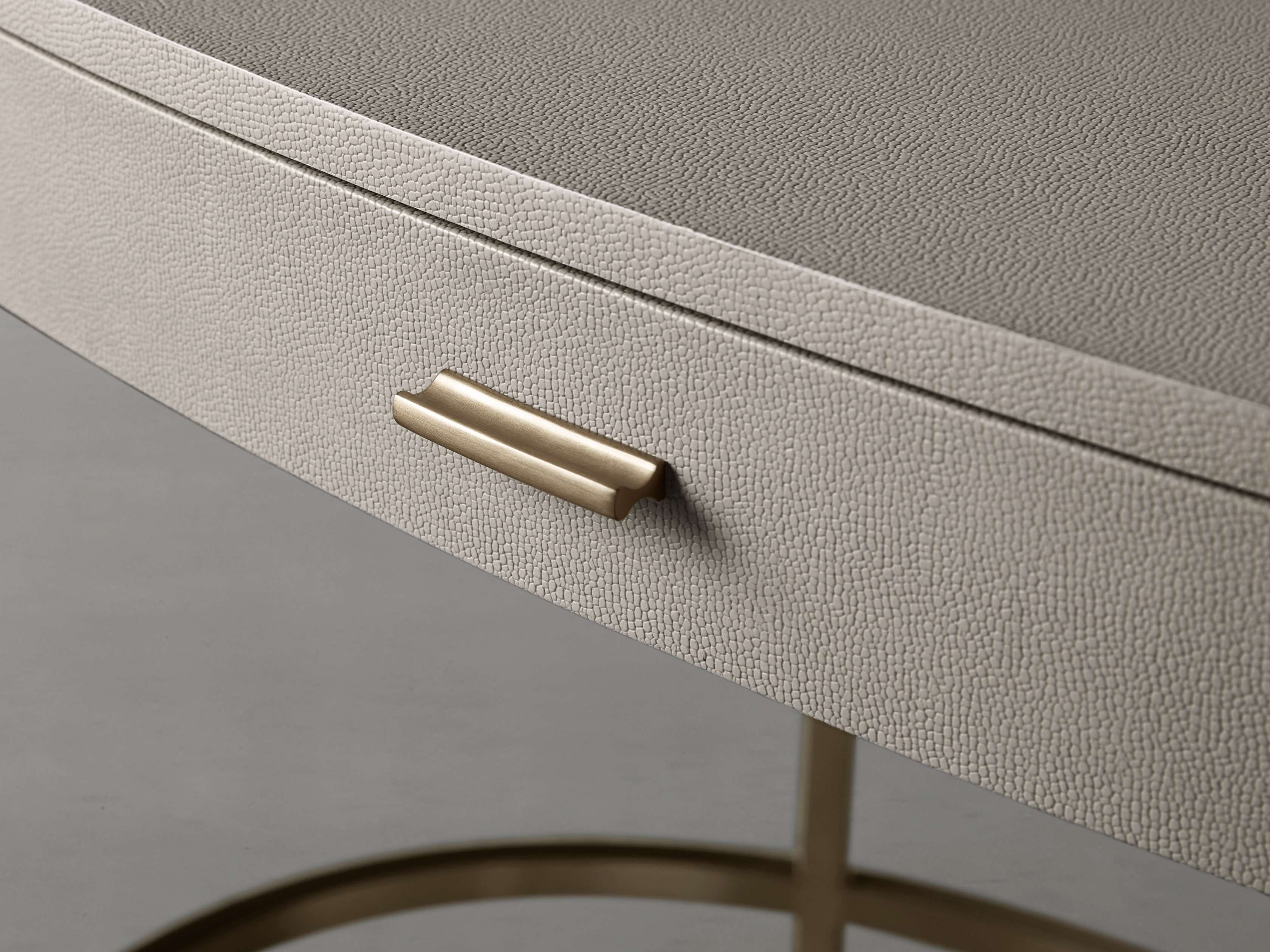 • Reconstituted leather insets are dyed and artfully embossed with textural shagreen detailing.