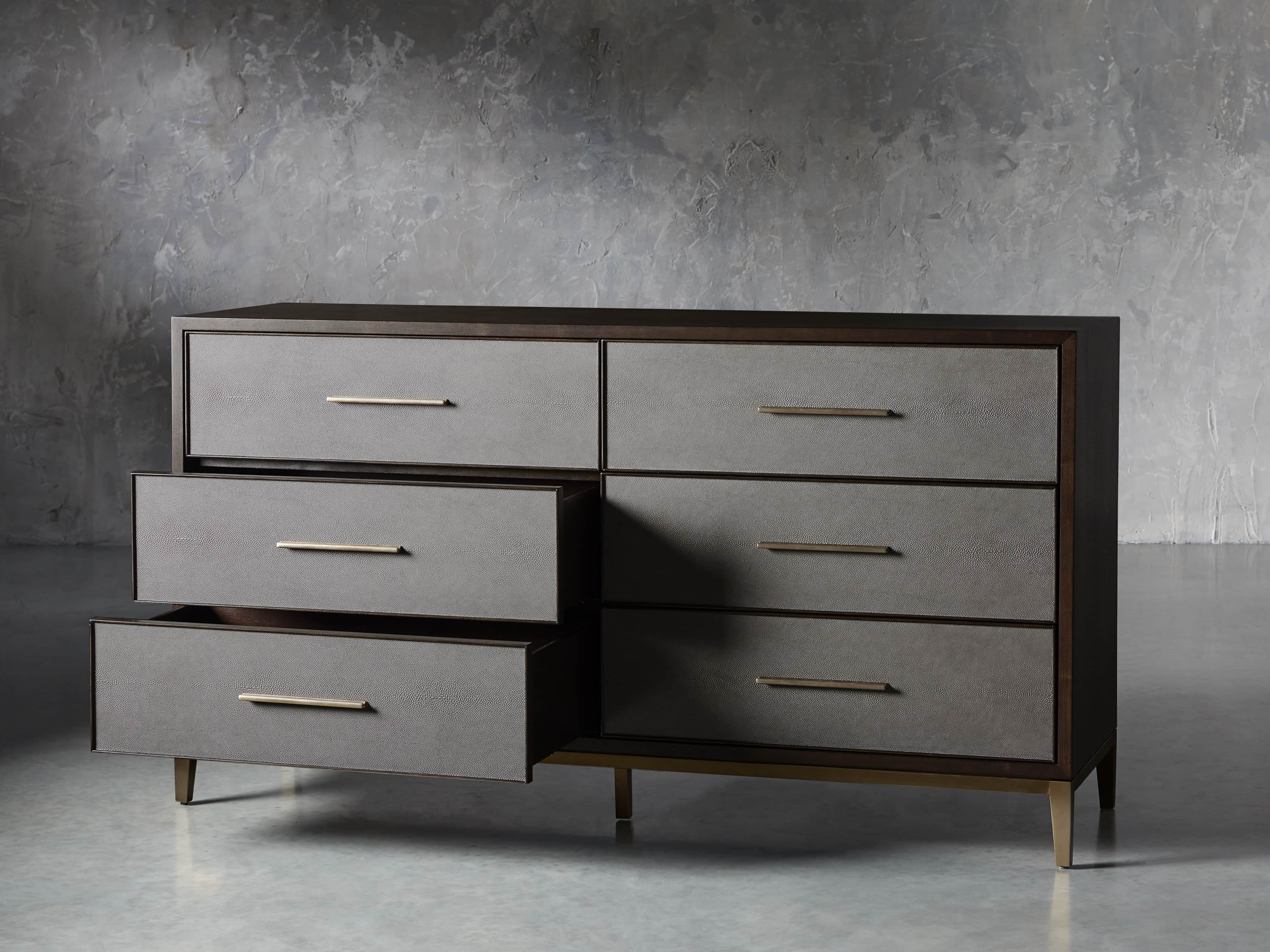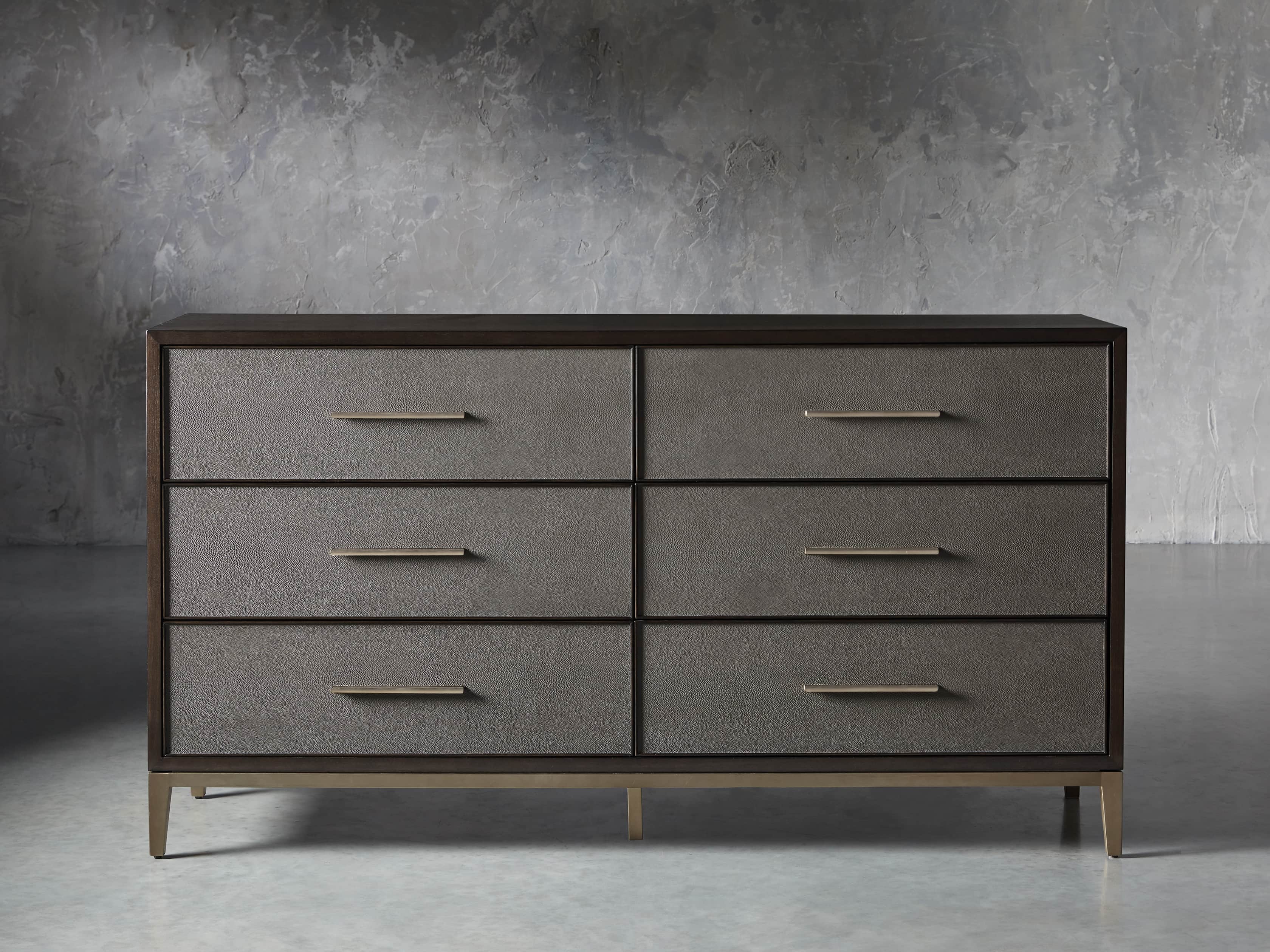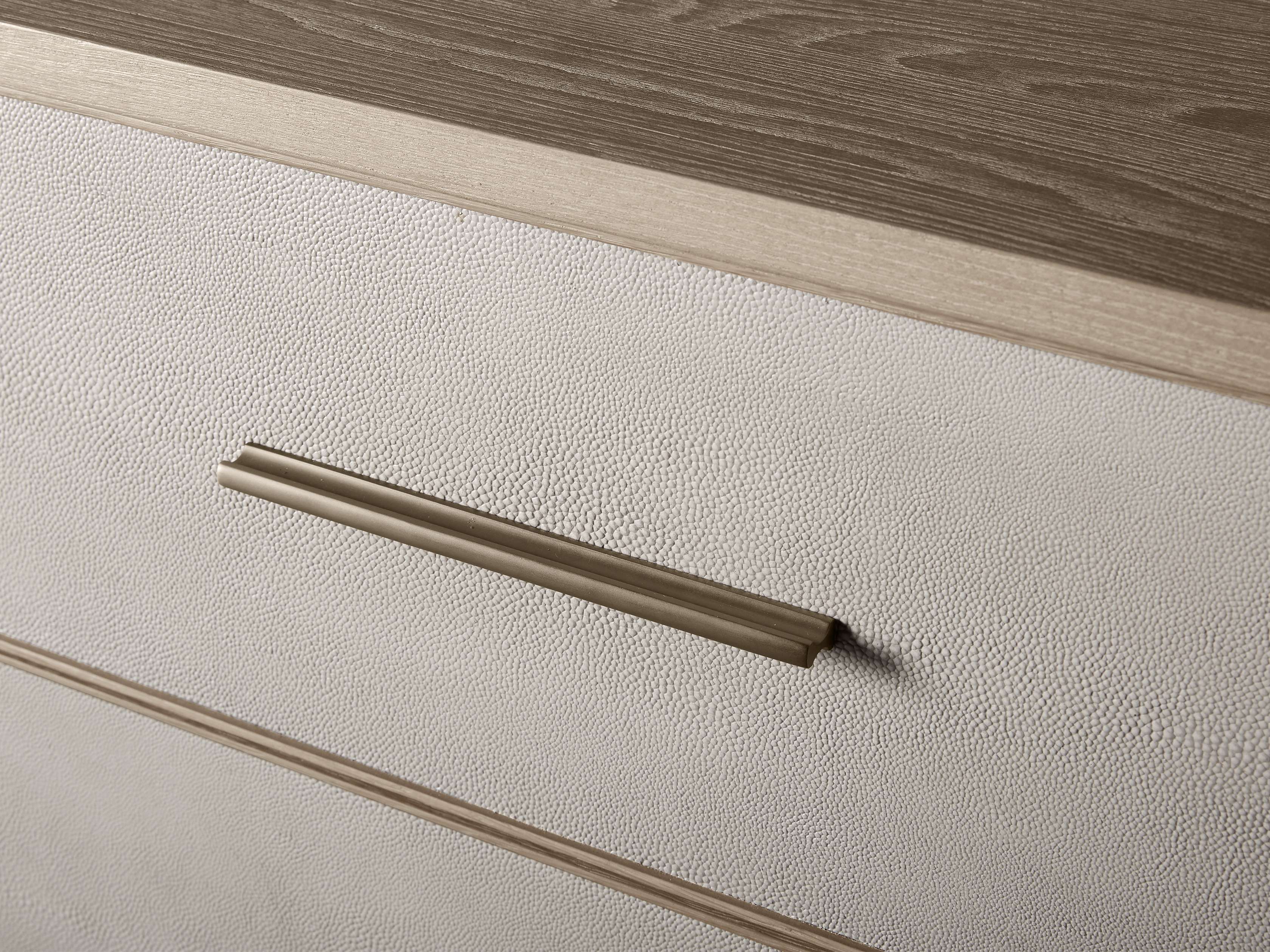 • Reconstituted leather insets are dyed and artfully embossed with textural shagreen detailing.