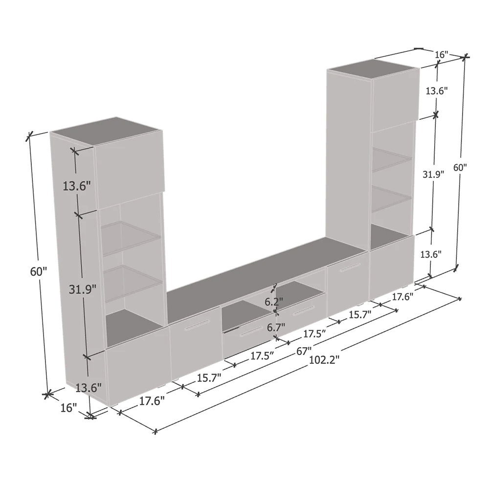 Abmessungen: 60 Zoll Höhe x 102 Zoll Breite x 16 Zoll Tiefe