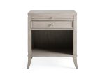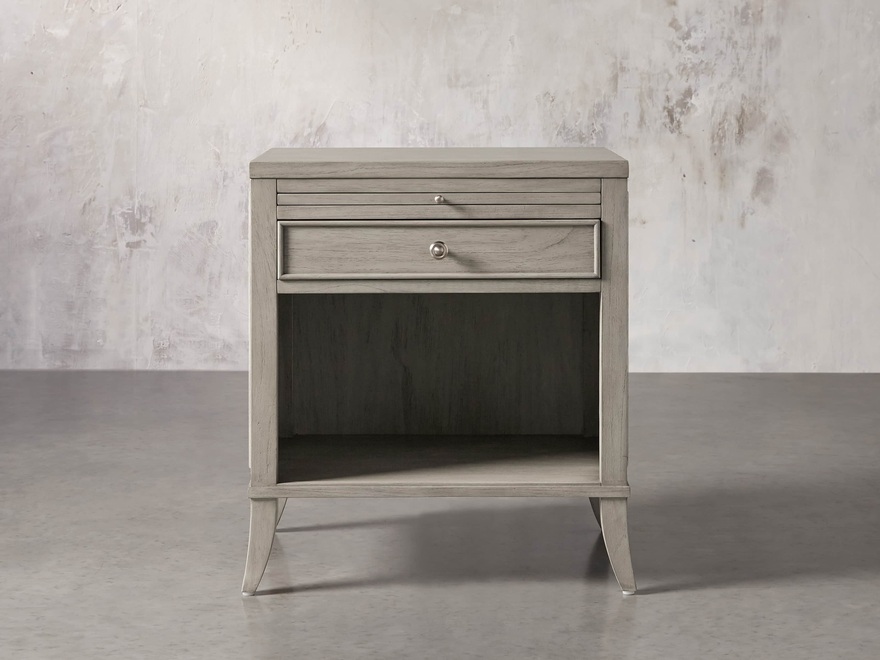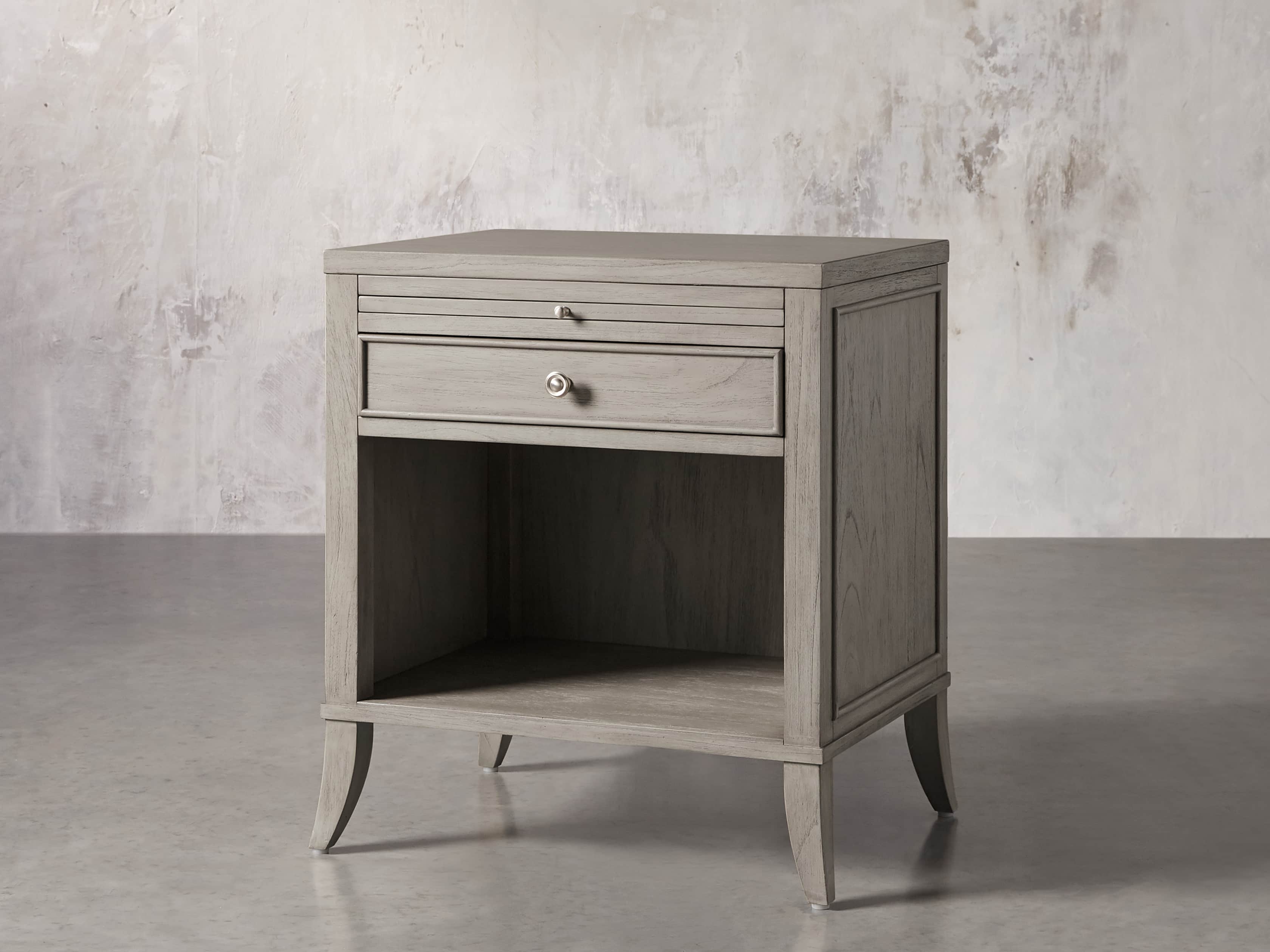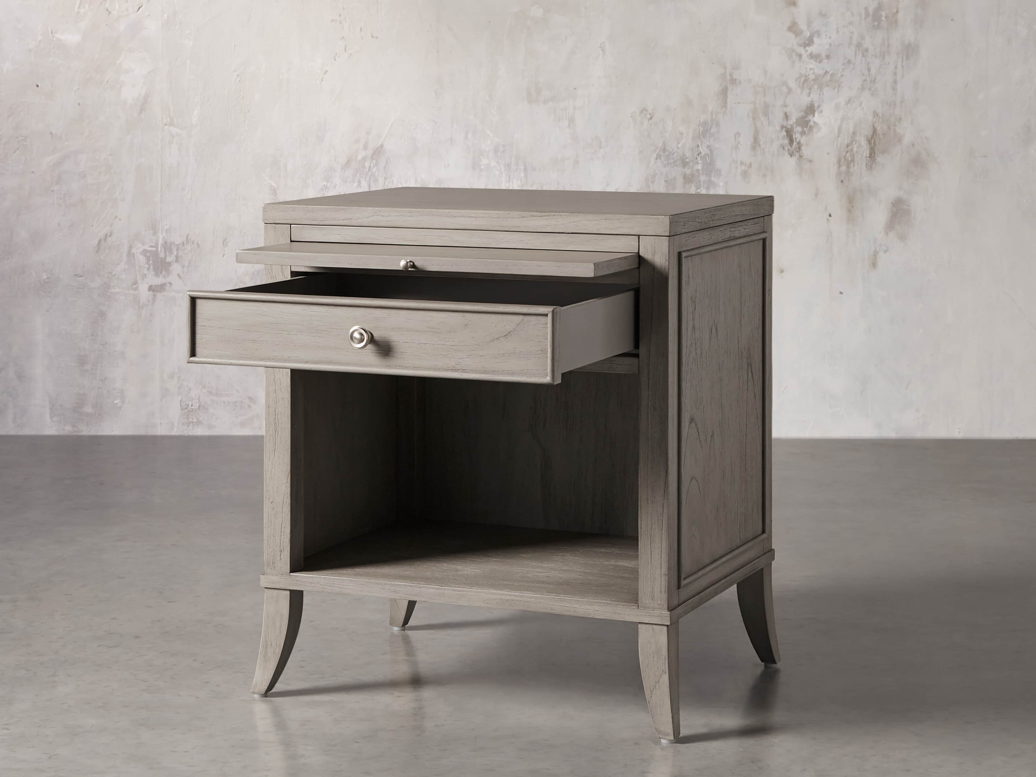- Nightstands feature pull-out trays for additional storage and open display space.