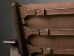 - Nubuck leather sling-style seats and backrests are tightly wrapped around the wood frame and secured with antique brass buckles.