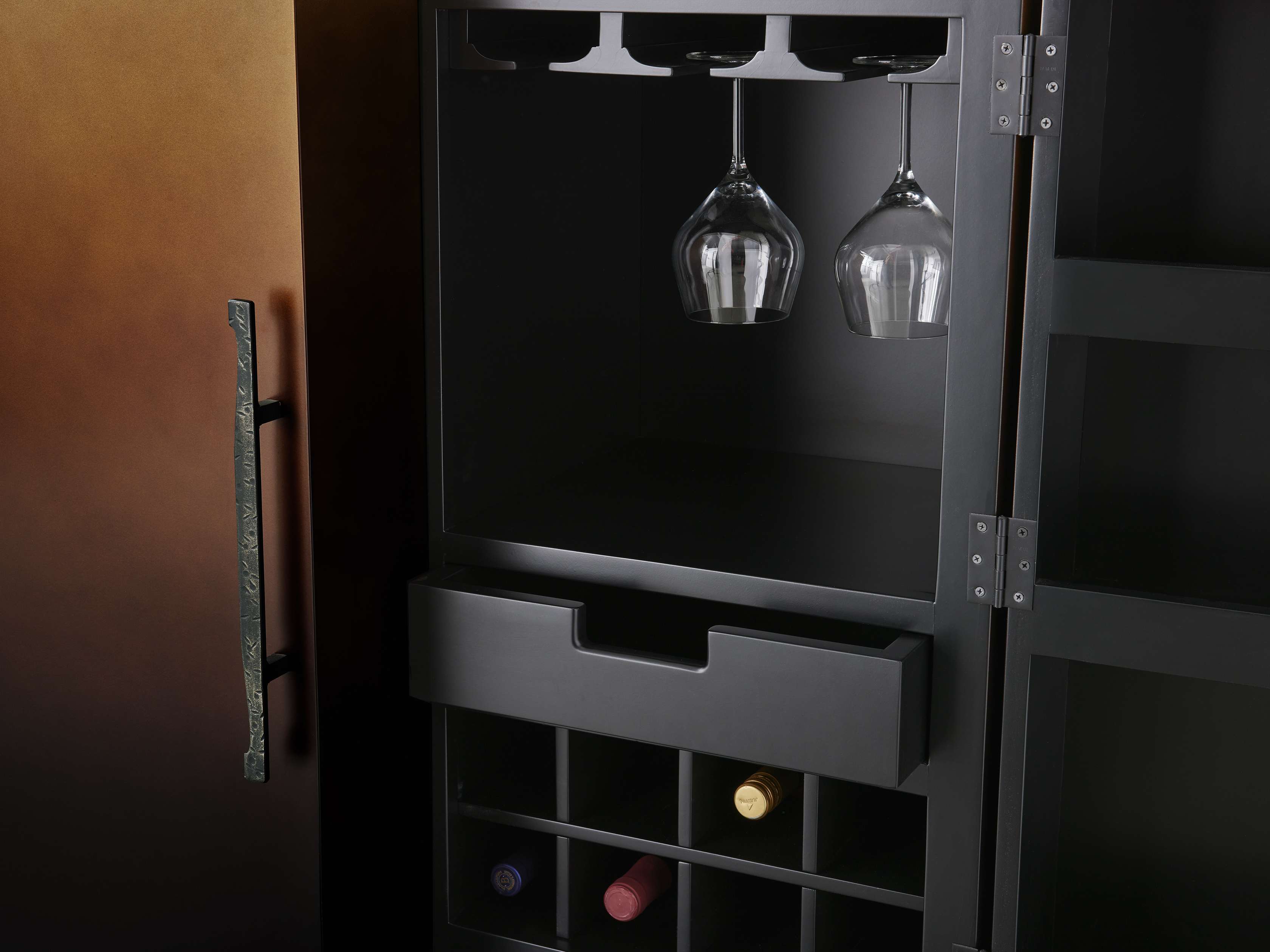 • Bar Cabinet includes wine glass and bottle storage in addition to two storage drawers.