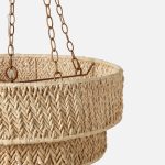 - Five metal chains in an antique brass finish refine the look.