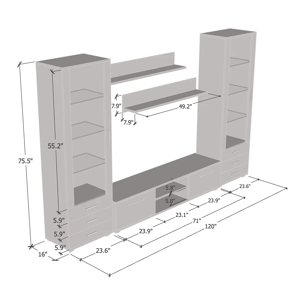 Set-Abmessungen: 75,5 Zoll Höhe x 120 Zoll Breite x 17 Zoll Tiefe. Abmessungen des S1-Bücherregals: 75,5 Zoll Höhe x 23,6 Zoll Breite x 16 Zoll Tiefe. Abmessungen des S3-TV-Ständers: 14,5 Zoll Höhe x 71 Zoll Breite x 17 Zoll Tiefe. Abmessungen des S5-Regals: 7,8 Zoll Höhe x 49 Zoll Breite x 7,8 Zoll Tiefe.