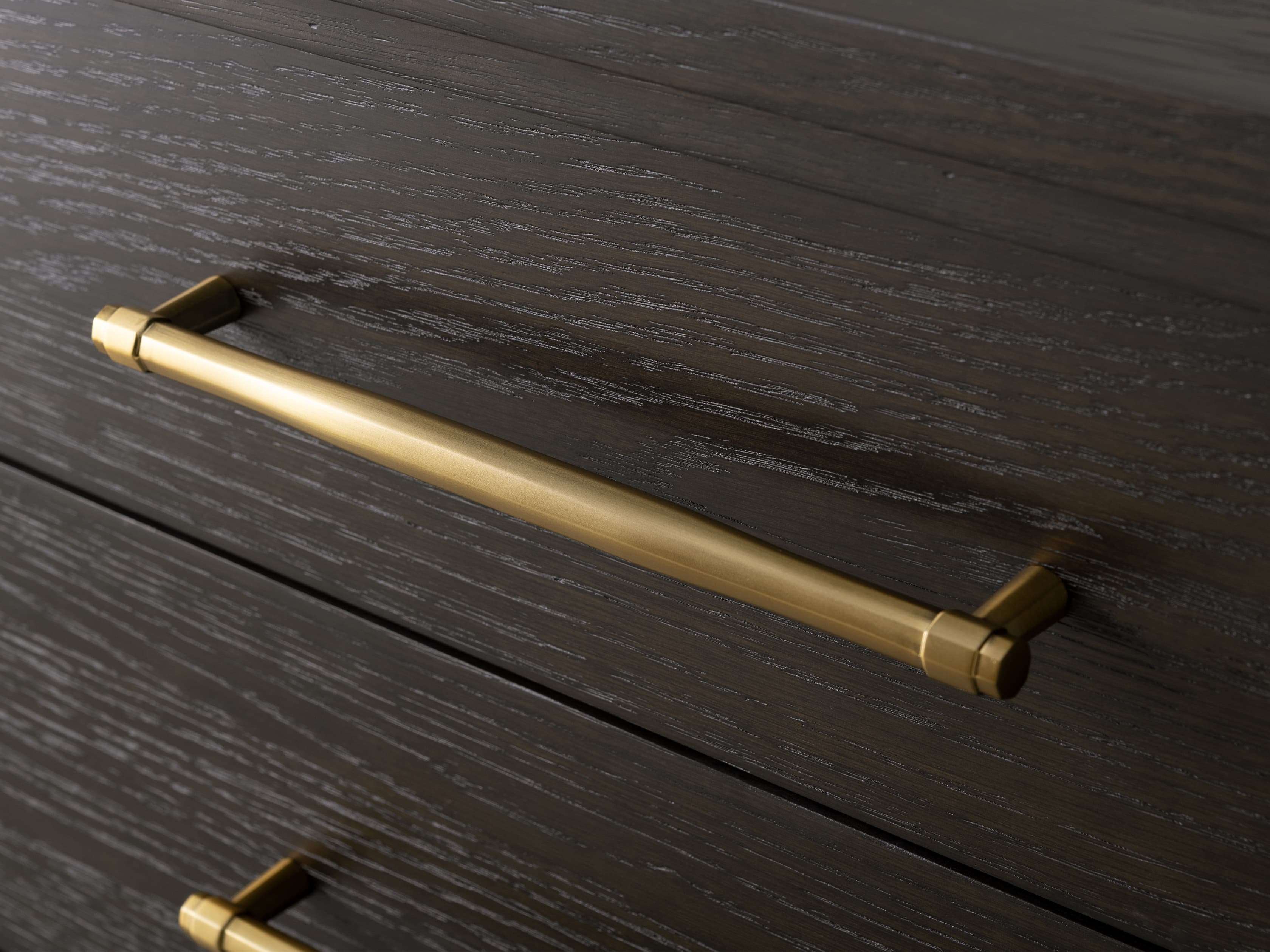 • Pieces finished in Smoke feature brass-finished hardware and pieces finished in Haze feature pewter-finished hardware.