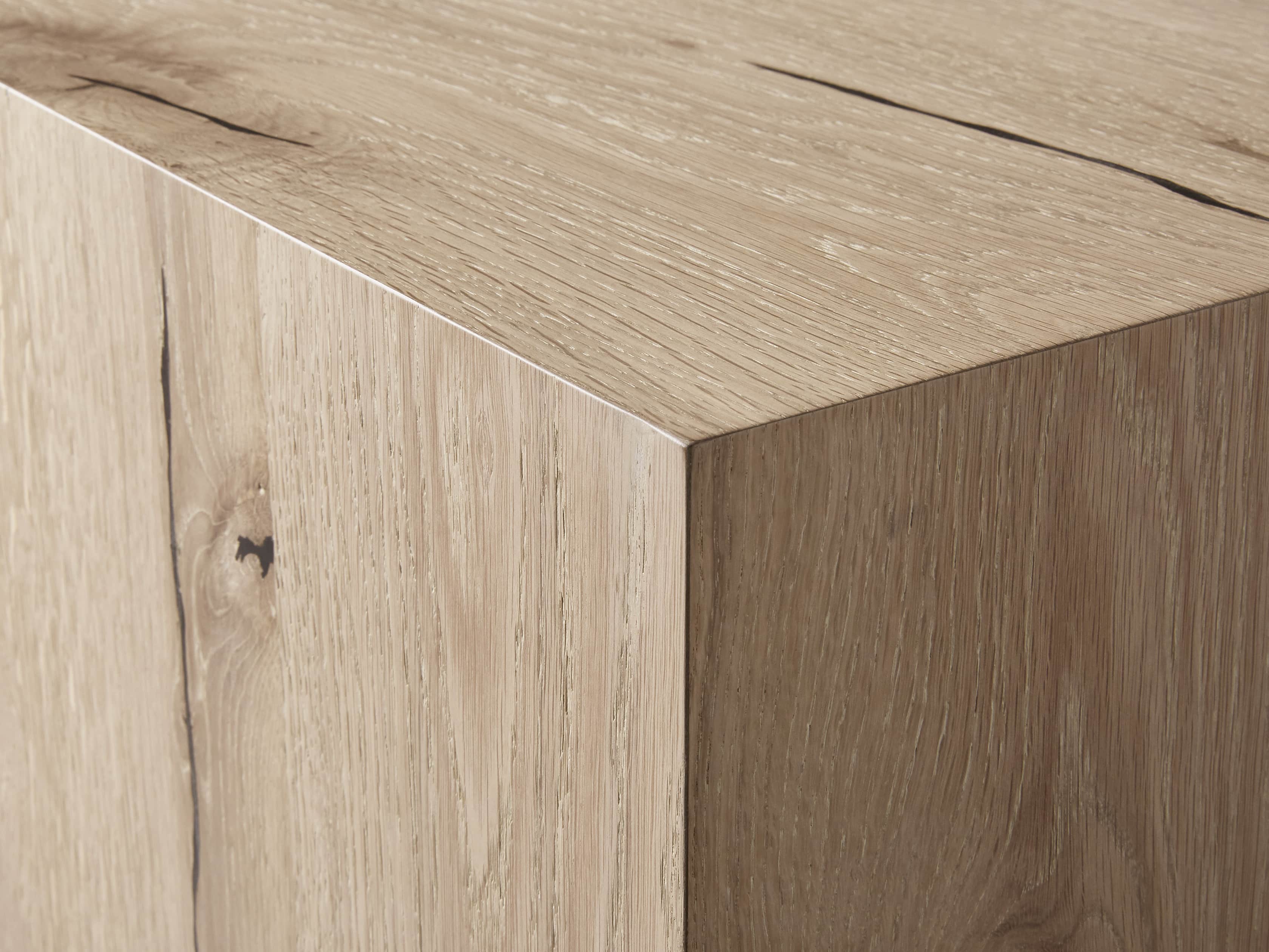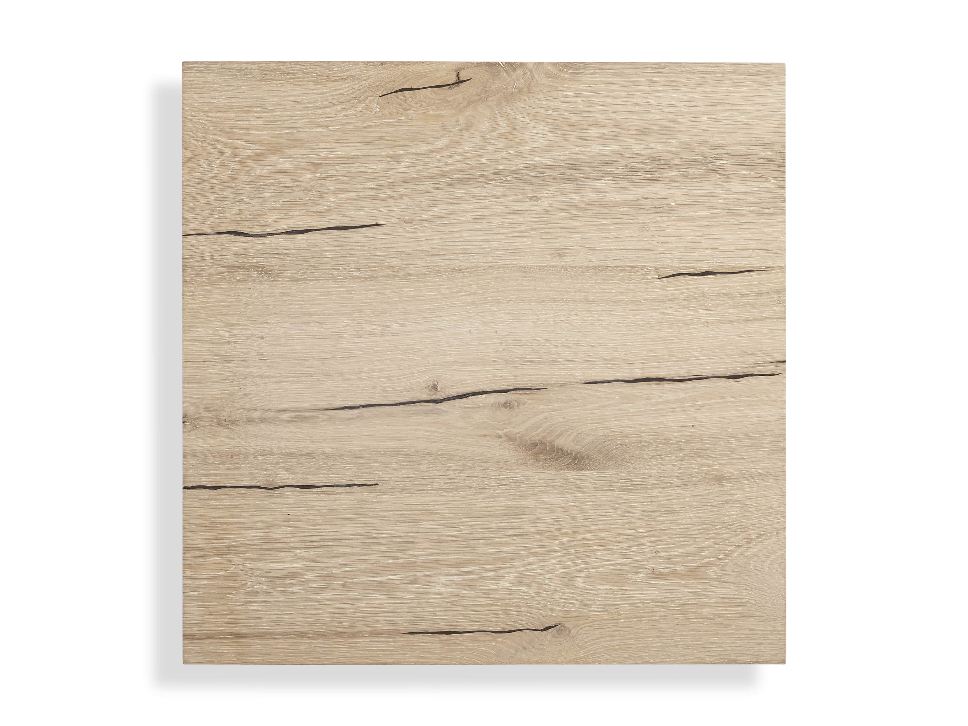 - Reclaimed European oak wood showcases natural weathering, unique cracks, joint lines, and saw marks. Cracks are filled with black resin to ensure a smooth surface.