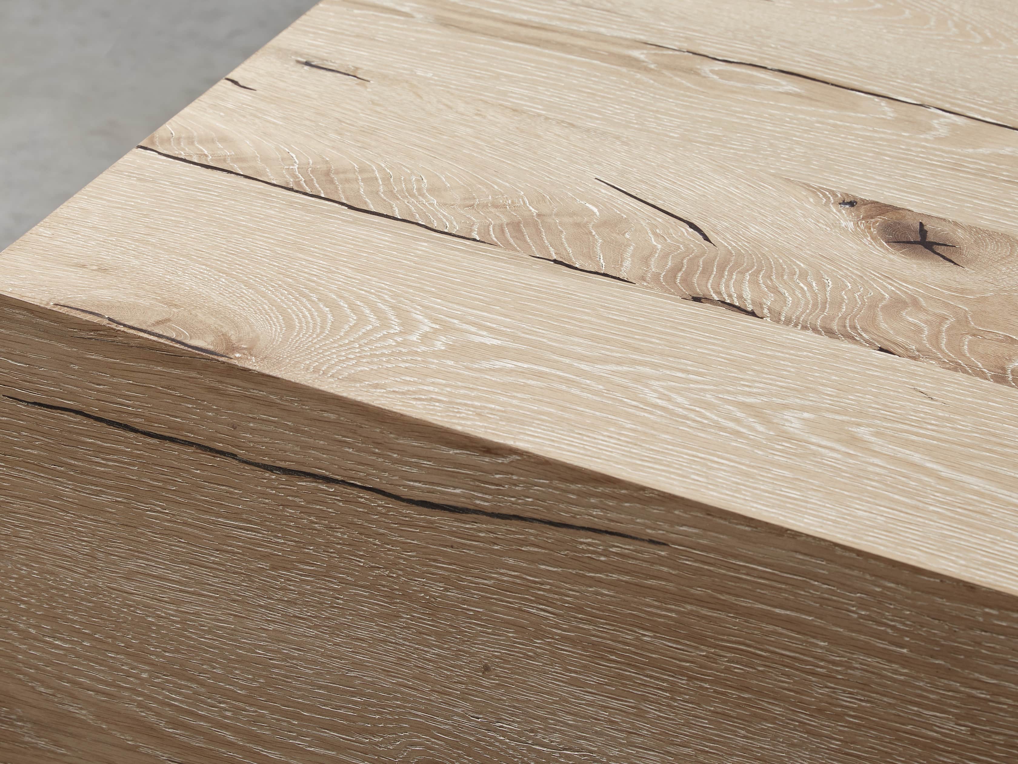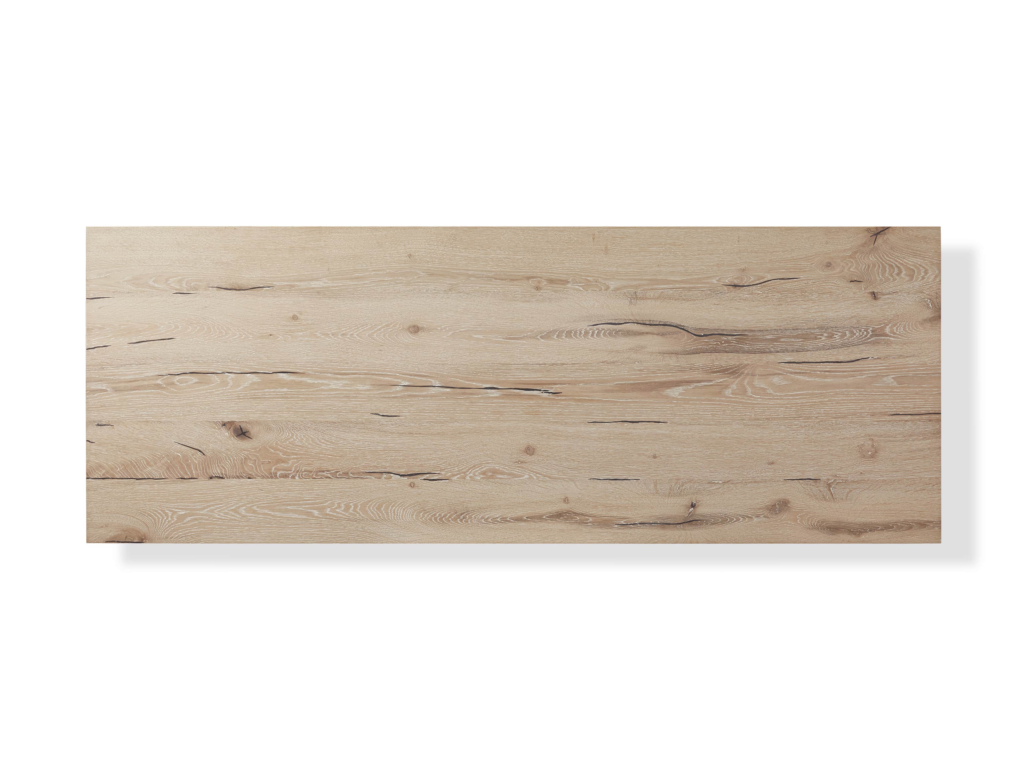 • Reclaimed European oak wood showcases natural weathering, unique cracks, joint lines, and saw marks. Cracks are filled with black resin to ensure a smooth surface.